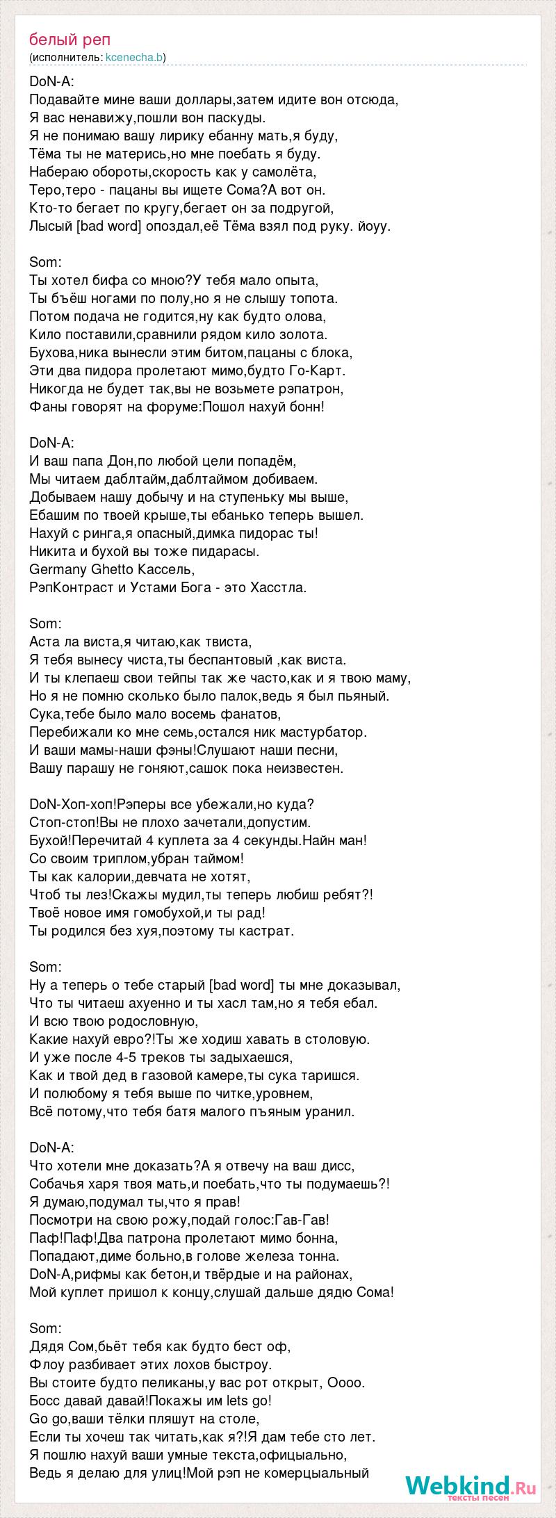 DoN-A: Подавайте мине ваши доллары,затем идите вон отсюда, Я вас ненавижу,пошли вон паскуды. Я не понимаю вашу лирику ебанну мать,я буду, Тёма ты не матерись,но мне поебать я буду. Набераю обороты,скорость как у самолёта, Теро,теро - пацаны вы ищете Сома?А вот он. Кто-то бегает по кругу,бегает он за подругой, Лысый [bad word] опоздал,её Тёма взял под руку. йоуу. Som: Ты хотел бифа со мною?У тебя мало опыта, Ты бъёш ногами по полу,но я не слышу топота. Потом подача не годится,ну как будто олова, Кило поставили,сравнили рядом кило золота. Бухова,ника вынесли этим битом,пацаны с блока, Эти два пидора пролетают мимо,будто Го-Карт. Никогда не будет так,вы не возьмете рэпатрон, Фаны говорят на форуме:Пошол нахуй бонн! DoN-A: И ваш папа Дон,по любой цели попадём, Мы читаем даблтайм,даблтаймом добиваем. Добываем нашу добычу и на ступеньку мы выше, Ебашим по твоей крыше,ты ебанько теперь вышел. Нахуй с ринга,я опасный,димка пидорас ты! Никита и бухой вы тоже пидарасы. Germany Ghetto Кассель, РэпКонтраст и Устами Бога - это Хасстла. Som: Аста ла виста,я читаю,как твиста, Я тебя вынесу чиста,ты беспантовый ,как виста. И ты клепаеш свои тейпы так же часто,как и я твою маму, Но я не помню сколько было палок,ведь я был пьяный. Сука,тебе было мало восемь фанатов, Перебижали ко мне семь,остался ник мастурбатор. И ваши мамы-наши фэны!Слушают наши песни, Вашу парашу не гоняют,сашок пока неизвестен. DoN-Хоп-хоп!Рэперы все убежали,но куда? Стоп-стоп!Вы не плохо зачетали,допустим. Бухой!Перечитай 4 куплета за 4 секунды.Найн ман! Со своим триплом,убран таймом! Ты как калории,девчата не хотят, Чтоб ты лез!Скажы мудил,ты теперь любиш ребят?! Твоё новое имя гомобухой,и ты рад! Ты родился без хуя,поэтому ты кастрат. Som: Ну а теперь о тебе старый [bad word] ты мне доказывал, Что ты читаеш ахуенно и ты хасл там,но я тебя ебал. И всю твою родословную, Какие нахуй евро?!Ты же ходиш хавать в столовую. И уже после 4-5 треков ты задыхаешся, Как и твой дед в газовой камере,ты сука таришся. И полюбому я тебя выше по читке,уровнем, Всё потому,что тебя батя малого пъяным уранил. DoN-A: Что хотели мне доказать?А я отвечу на ваш дисс, Собачья харя твоя мать,и поебать,что ты подумаешь?! Я думаю,подумал ты,что я прав! Посмотри на свою рожу,подай голос:Гав-Гав! Паф!Паф!Два патрона пролетают мимо бонна, Попадают,диме больно,в голове железа тонна. DoN-A,рифмы как бетон,и твёрдые и на районах, Мой куплет пришол к концу,слушай дальше дядю Сома! Som: Дядя Сом,бьёт тебя как будто бест оф, Флоу разбивает этих лохов быстроу. Вы стоите будто пеликаны,у вас рот открыт, Оооо. Босс давай давай!Покажы им lets go! Go go,ваши тёлки пляшут на столе, Если ты хочеш так читать,как я?!Я дам тебе сто лет. Я пошлю нахуй ваши умные текста,офицыально, Ведь я делаю для улиц!Мой рэп не комерцыальный