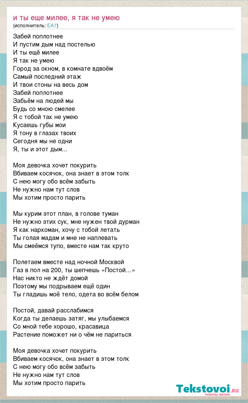 Забей поплотнее И пустим дым над постелью И ты ещё милее Я так не умею Город за окном, в комнате вдвоём Самый последний этаж И твои стоны на весь дом Забей поплотнее Забьём на людей мы Будь со мною смелее Я с тобой так не умею Кусаешь губы мои Я тону в глазах твоих Сегодня мы не одни Я, ты и этот дым... Моя девочка хочет покурить Вбиваем косячок, она знает в этом толк С нею могу обо всём забыть Не нужно нам тут слов Мы хотим просто парить Мы курим этот план, в голове туман Не нужно этих сук, мне нужен твой дурман Я как наркоман, хочу с тобой летать Ты голая мадам и мне не наплевать Мы смеёмся тупо, вместе нам так круто Полетаем вместе над ночной Москвой Газ в пол на 200, ты шепчешь «Постой…» Нас никто не ждёт домой Поэтому мы подрываем ещё один Ты гладишь моё тело, одета во всём белом Постой, давай расслабимся Когда ты делаешь затяг, мы улыбаемся Со мной тебе хорошо, красавица Растение поможет ни о чём не париться Моя девочка хочет покурить Вбиваем косячок, она знает в этом толк С нею могу обо всём забыть Не нужно нам тут слов Мы хотим просто парить