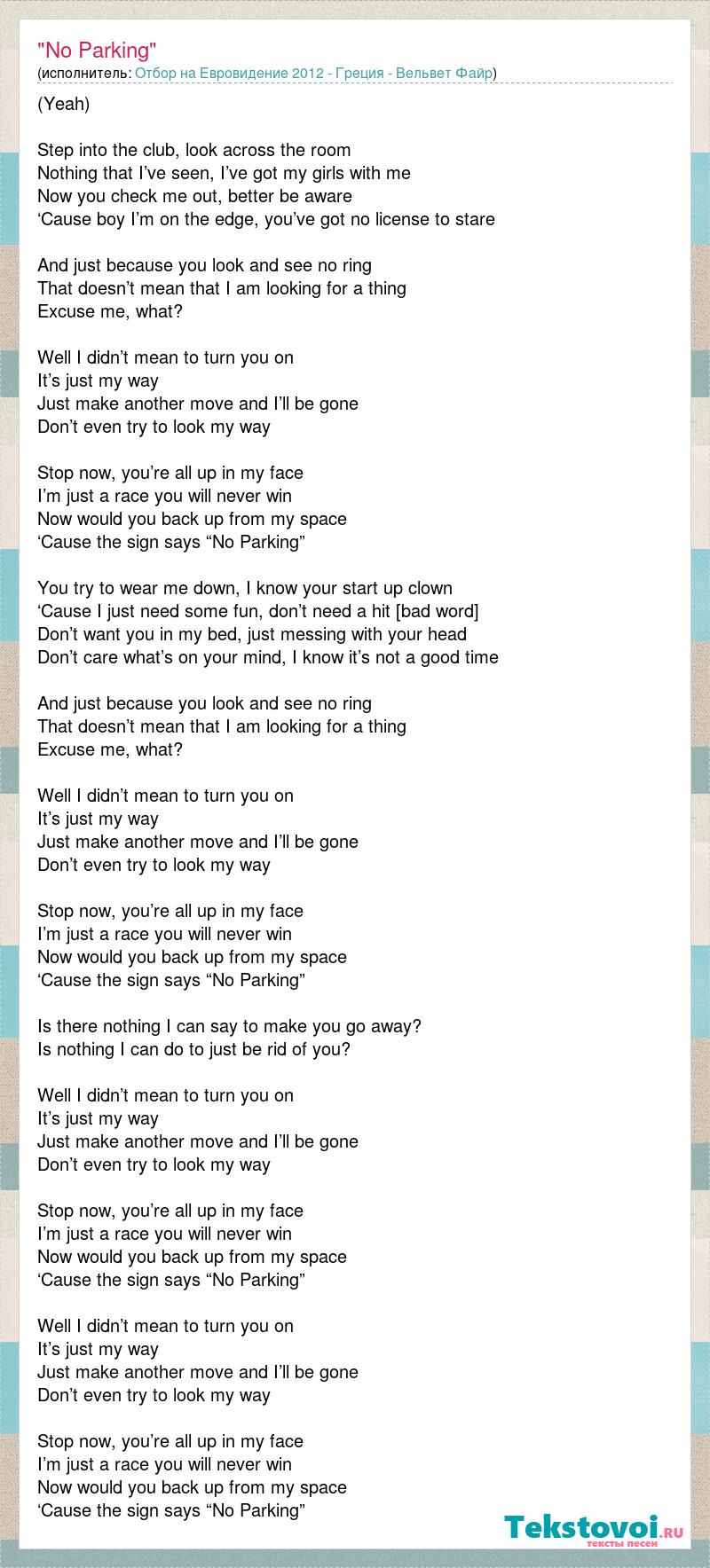 (Yeah) Step into the club, look across the room Nothing that I’ve seen, I’ve got my girls with me Now you check me out, better be aware ‘Cause boy I’m on the edge, you’ve got no license to stare And just because you look and see no ring That doesn’t mean that I am looking for a thing Excuse me, what? Well I didn’t mean to turn you on It’s just my way Just make another move and I’ll be gone Don’t even try to look my way Stop now, you’re all up in my face I’m just a race you will never win Now would you back up from my space ‘Cause the sign says “No Parking” You try to wear me down, I know your start up clown ‘Cause I just need some fun, don’t need a hit [bad word] Don’t want you in my bed, just messing with your head Don’t care what’s on your mind, I know it’s not a good time And just because you look and see no ring That doesn’t mean that I am looking for a thing Excuse me, what? Well I didn’t mean to turn you on It’s just my way Just make another move and I’ll be gone Don’t even try to look my way Stop now, you’re all up in my face I’m just a race you will never win Now would you back up from my space ‘Cause the sign says “No Parking” Is there nothing I can say to make you go away? Is nothing I can do to just be rid of you? Well I didn’t mean to turn you on It’s just my way Just make another move and I’ll be gone Don’t even try to look my way Stop now, you’re all up in my face I’m just a race you will never win Now would you back up from my space ‘Cause the sign says “No Parking” Well I didn’t mean to turn you on It’s just my way Just make another move and I’ll be gone Don’t even try to look my way Stop now, you’re all up in my face I’m just a race you will never win Now would you back up from my space ‘Cause the sign says “No Parking”