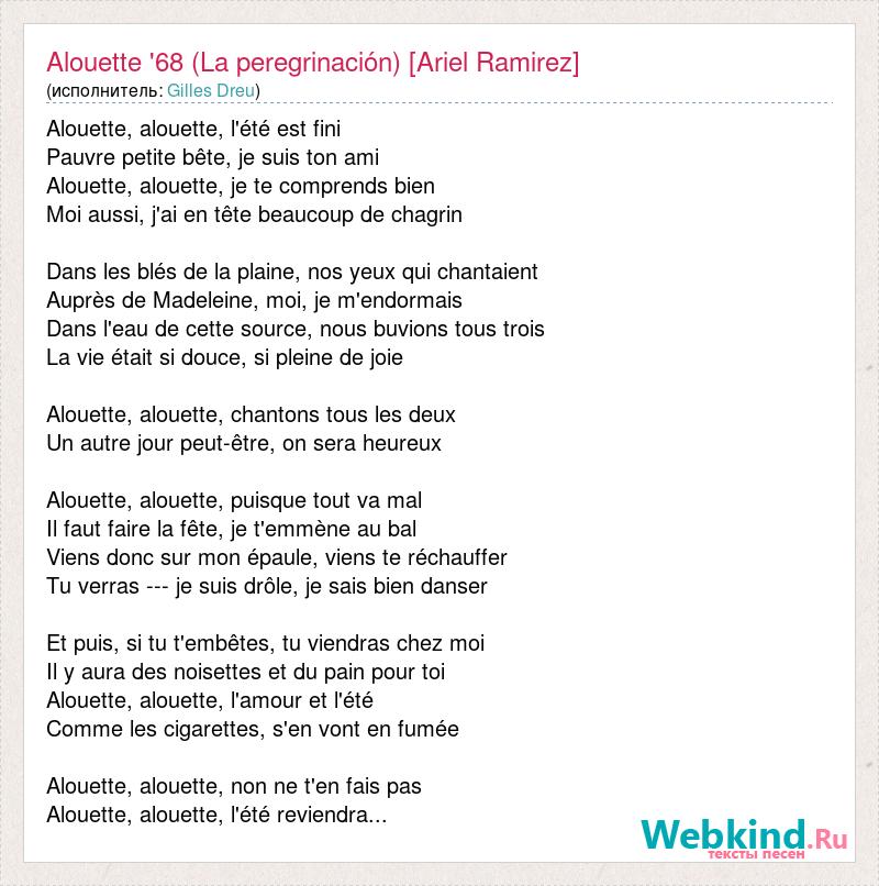 Alouette, alouette, l'été est fini Pauvre petite bête, je suis ton ami Alouette, alouette, je te comprends bien Moi aussi, j'ai en tête beaucoup de chagrin Dans les blés de la plaine, nos yeux qui chantaient Auprès de Madeleine, moi, je m'endormais Dans l'eau de cette source, nous buvions tous trois La vie était si douce, si pleine de joie Alouette, alouette, chantons tous les deux Un autre jour peut-être, on sera heureux Alouette, alouette, puisque tout va mal Il faut faire la fête, je t'emmène au bal Viens donc sur mon épaule, viens te réchauffer Tu verras --- je suis drôle, je sais bien danser Et puis, si tu t'embêtes, tu viendras chez moi Il y aura des noisettes et du pain pour toi Alouette, alouette, l'amour et l'été Comme les cigarettes, s'en vont en fumée Alouette, alouette, non ne t'en fais pas Alouette, alouette, l'été reviendra...