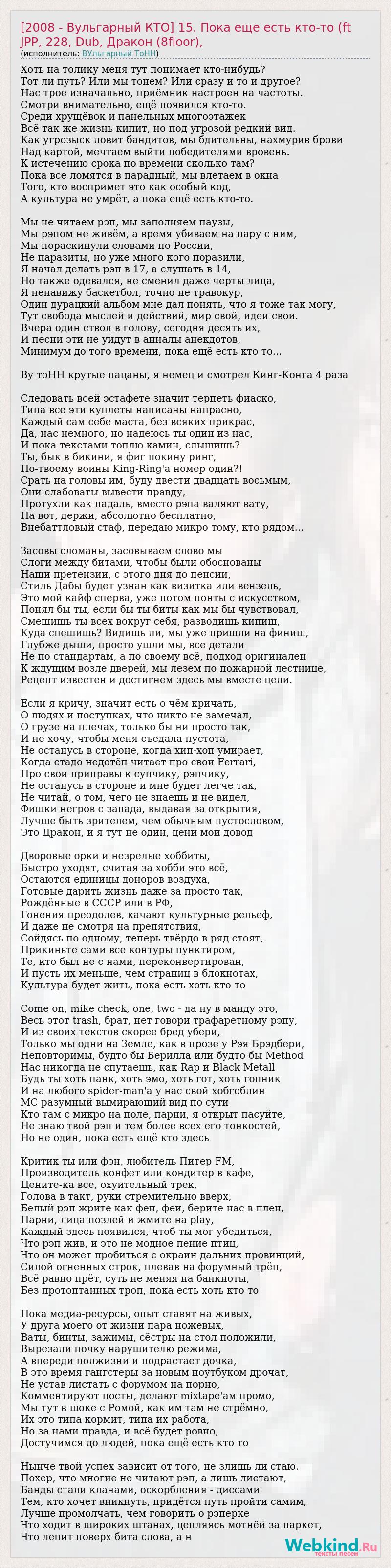 Хоть на толику меня тут понимает кто-нибудь? Тот ли путь? Или мы тонем? Или сразу и то и другое? Нас трое изначально, приёмник настроен на частоты. Смотри внимательно, ещё появился кто-то. Среди хрущёвок и панельных многоэтажек Всё так же жизнь кипит, но под угрозой редкий вид. Как угрозыск ловит бандитов, мы бдительны, нахмурив брови Над картой, мечтаем выйти победителями вровень. К истечению срока по времени сколько там? Пока все ломятся в парадный, мы влетаем в окна Того, кто воспримет это как особый код, А культура не умрёт, а пока ещё есть кто-то. Мы не читаем рэп, мы заполняем паузы, Мы рэпом не живём, а время убиваем на пару с ним, Мы пораскинули словами по России, Не паразиты, но уже много кого поразили, Я начал делать рэп в 17, а слушать в 14, Но также одевался, не сменил даже черты лица, Я ненавижу баскетбол, точно не травокур, Один дурацкий альбом мне дал понять, что я тоже так могу, Тут свобода мыслей и действий, мир свой, идеи свои. Вчера один ствол в голову, сегодня десять их, И песни эти не уйдут в анналы анекдотов, Минимум до того времени, пока ещё есть кто то... Ву тоНН крутые пацаны, я немец и смотрел Кинг-Конга 4 раза Следовать всей эстафете значит терпеть фиаско, Типа все эти куплеты написаны напрасно, Каждый сам себе маста, без всяких прикрас, Да, нас немного, но надеюсь ты один из нас, И пока текстами топлю камин, слышишь? Ты, бык в бикини, я фиг покину ринг, По-твоему воины King-Ring'а номер один?! Срать на головы им, буду двести двадцать восьмым, Они слабоваты вывести правду, Протухли как падаль, вместо рэпа валяют вату, На вот, держи, абсолютно бесплатно, Внебаттловый стаф, передаю микро тому, кто рядом... Засовы сломаны, засовываем слово мы Слоги между битами, чтобы были обоснованы Наши претензии, с этого дня до пенсии, Стиль Дабы будет узнан как визитка или вензель, Это мой кайф сперва, уже потом понты с искусством, Понял бы ты, если бы ты биты как мы бы чувствовал, Смешишь ты всех вокруг себя, разводишь кипиш, Куда спешишь? Видишь ли, мы уже пришли на финиш, Глубже дыши, просто ушли мы, все детали Не по стандартам, а по своему всё, подход оригинален К ждущим возле дверей, мы лезем по пожарной лестнице, Рецепт известен и достигнем здесь мы вместе цели. Если я кричу, значит есть о чём кричать, О людях и поступках, что никто не замечал, О грузе на плечах, только бы ни просто так, И не хочу, чтобы меня съедала пустота, Не останусь в стороне, когда хип-хоп умирает, Когда стадо недотёп читает про свои Ferrari, Про свои приправы к супчику, рэпчику, Не останусь в стороне и мне будет легче так, Не читай, о том, чего не знаешь и не видел, Фишки негров с запада, выдавая за открытия, Лучше быть зрителем, чем обычным пустословом, Это Дракон, и я тут не один, цени мой довод Дворовые орки и незрелые хоббиты, Быстро уходят, считая за хобби это всё, Остаются единицы доноров воздуха, Готовые дарить жизнь даже за просто так, Рождённые в СССР или в РФ, Гонения преодолев, качают культурные рельеф, И даже не смотря на препятствия, Сойдясь по одному, теперь твёрдо в ряд стоят, Прикиньте сами все контуры пунктиром, Те, кто был не с нами, переконвертирован, И пусть их меньше, чем страниц в блокнотах, Культура будет жить, пока есть хоть кто то Come on, mike check, one, two - да ну в манду это, Весь этот trash, брат, нет говори трафаретному рэпу, И из своих текстов скорее бред убери, Только мы одни на Земле, как в прозе у Рэя Б