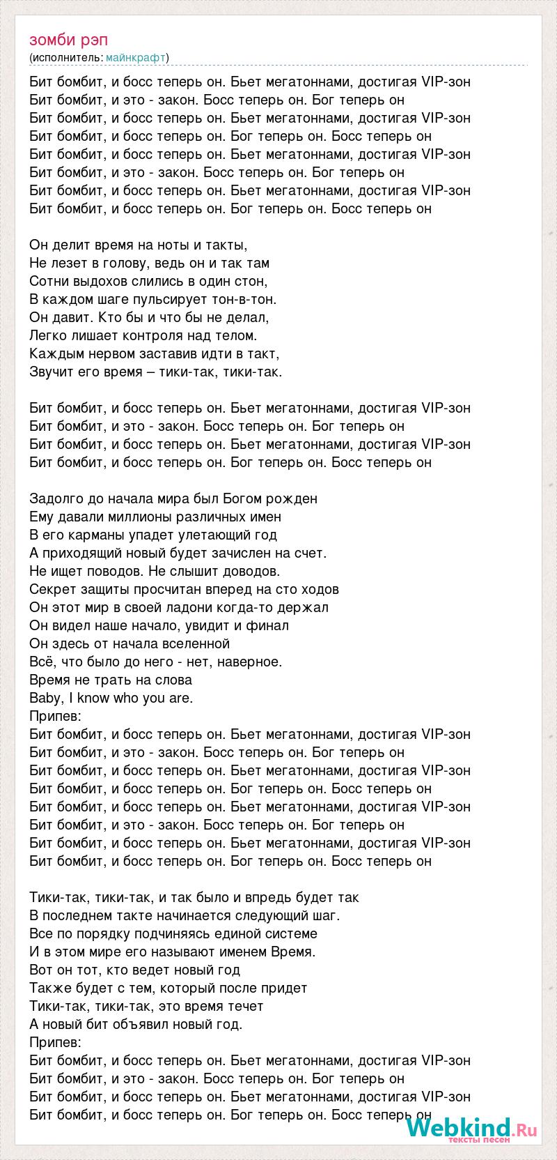Бит бомбит, и босс теперь он. Бьет мегатоннами, достигая VIP-зон Бит бомбит, и это - закон. Босс теперь он. Бог теперь он Бит бомбит, и босс теперь он. Бьет мегатоннами, достигая VIP-зон Бит бомбит, и босс теперь он. Бог теперь он. Босс теперь он Бит бомбит, и босс теперь он. Бьет мегатоннами, достигая VIP-зон Бит бомбит, и это - закон. Босс теперь он. Бог теперь он Бит бомбит, и босс теперь он. Бьет мегатоннами, достигая VIP-зон Бит бомбит, и босс теперь он. Бог теперь он. Босс теперь он Он делит время на ноты и такты, Не лезет в голову, ведь он и так там Сотни выдохов слились в один стон, В каждом шаге пульсирует тон-в-тон. Он давит. Кто бы и что бы не делал, Легко лишает контроля над телом. Каждым нервом заставив идти в такт, Звучит его время – тики-так, тики-так. Бит бомбит, и босс теперь он. Бьет мегатоннами, достигая VIP-зон Бит бомбит, и это - закон. Босс теперь он. Бог теперь он Бит бомбит, и босс теперь он. Бьет мегатоннами, достигая VIP-зон Бит бомбит, и босс теперь он. Бог теперь он. Босс теперь он Задолго до начала мира был Богом рожден Ему давали миллионы различных имен В его карманы упадет улетающий год А приходящий новый будет зачислен на счет. Не ищет поводов. Не слышит доводов. Секрет защиты просчитан вперед на сто ходов Он этот мир в своей ладони когда-то держал Он видел наше начало, увидит и финал Он здесь от начала вселенной Всё, что было до него - нет, наверное. Время не трать на слова Baby, I know who you are. Припев: Бит бомбит, и босс теперь он. Бьет мегатоннами, достигая VIP-зон Бит бомбит, и это - закон. Босс теперь он. Бог теперь он Бит бомбит, и босс теперь он. Бьет мегатоннами, достигая VIP-зон Бит бомбит, и босс теперь он. Бог теперь он. Босс теперь он Бит бомбит, и босс теперь он. Бьет мегатоннами, достигая VIP-зон Бит бомбит, и это - закон. Босс теперь он. Бог теперь он Бит бомбит, и босс теперь он. Бьет мегатоннами, достигая VIP-зон Бит бомбит, и босс теперь он. Бог теперь он. Босс теперь он Тики-так, тики-так, и так было и впредь будет так В последнем такте начинается следующий шаг. Все по порядку подчиняясь единой системе И в этом мире его называют именем Время. Вот он тот, кто ведет новый год Также будет с тем, который после придет Тики-так, тики-так, это время течет А новый бит объявил новый год. Припев: Бит бомбит, и босс теперь он. Бьет мегатоннами, достигая VIP-зон Бит бомбит, и это - закон. Босс теперь он. Бог теперь он Бит бомбит, и босс теперь он. Бьет мегатоннами, достигая VIP-зон Бит бомбит, и босс теперь он. Бог теперь он. Босс теперь он