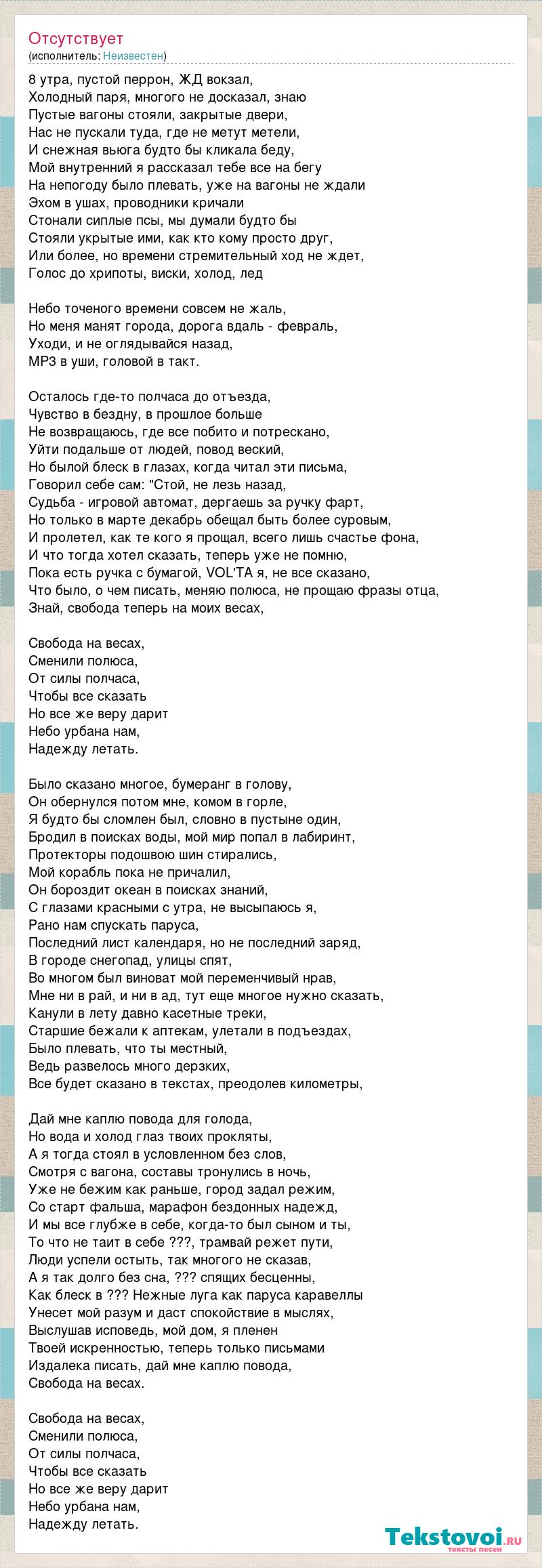8 утра, пустой перрон, ЖД вокзал, Холодный паря, многого не досказал, знаю Пустые вагоны стояли, закрытые двери, Нас не пускали туда, где не метут метели, И снежная вьюга будто бы кликала беду, Мой внутренний я рассказал тебе все на бегу На непогоду было плевать, уже на вагоны не ждали Эхом в ушах, проводники кричали Стонали сиплые псы, мы думали будто бы Стояли укрытые ими, как кто кому просто друг, Или более, но времени стремительный ход не ждет, Голос до хрипоты, виски, холод, лед Небо точеного времени совсем не жаль, Но меня манят города, дорога вдаль - февраль, Уходи, и не оглядывайся назад, MP3 в уши, головой в такт. Осталось где-то полчаса до отъезда, Чувство в бездну, в прошлое больше Не возвращаюсь, где все побито и потрескано, Уйти подальше от людей, повод веский, Но былой блеск в глазах, когда читал эти письма, Говорил себе сам: "Стой, не лезь назад, Судьба - игровой автомат, дергаешь за ручку фарт, Но только в марте декабрь обещал быть более суровым, И пролетел, как те кого я прощал, всего лишь счастье фона, И что тогда хотел сказать, теперь уже не помню, Пока есть ручка с бумагой, VOL'TA я, не все сказано, Что было, о чем писать, меняю полюса, не прощаю фразы отца, Знай, свобода теперь на моих весах, Свобода на весах, Сменили полюса, От силы полчаса, Чтобы все сказать Но все же веру дарит Небо урбана нам, Надежду летать. Было сказано многое, бумеранг в голову, Он обернулся потом мне, комом в горле, Я будто бы сломлен был, словно в пустыне один, Бродил в поисках воды, мой мир попал в лабиринт, Протекторы подошвою шин стирались, Мой корабль пока не причалил, Он бороздит океан в поисках знаний, С глазами красными с утра, не высыпаюсь я, Рано нам спускать паруса, Последний лист календаря, но не последний заряд, В городе снегопад, улицы спят, Во многом был виноват мой переменчивый нрав, Мне ни в рай, и ни в ад, тут еще многое нужно сказать, Канули в лету давно касетные треки, Старшие бежали к аптекам, улетали в подъездах, Было плевать, что ты местный, Ведь развелось много дерзких, Все будет сказано в текстах, преодолев километры, Дай мне каплю повода для голода, Но вода и холод глаз твоих прокляты, А я тогда стоял в условленном без слов, Смотря с вагона, составы тронулись в ночь, Уже не бежим как раньше, город задал режим, Со старт фальша, марафон бездонных надежд, И мы все глубже в себе, когда-то был сыном и ты, То что не таит в себе ???, трамвай режет пути, Люди успели остыть, так многого не сказав, А я так долго без сна, ??? спящих бесценны, Как блеск в ??? Нежные луга как паруса каравеллы Унесет мой разум и даст спокойствие в мыслях, Выслушав исповедь, мой дом, я пленен Твоей искренностью, теперь только письмами Издалека писать, дай мне каплю повода, Свобода на весах. Свобода на весах, Сменили полюса, От силы полчаса, Чтобы все сказать Но все же веру дарит Небо урбана нам, Надежду летать.