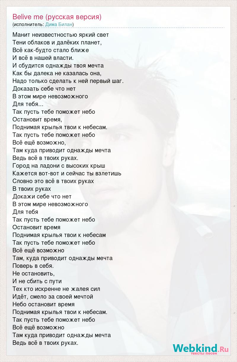 Манит неизвестностью яркий свет Тени облаков и далёких планет, Всё как-будто стало ближе И всё в нашей власти. И сбудится однажды твоя мечта Как бы далека не казалась она, Надо только сделать к ней первый шаг. Доказать себе что нет В этом мире невозможного Для тебя... Так пусть тебе поможет небо Остановит время, Поднимая крылья твои к небесам. Так пусть тебе поможет небо Всё ещё возможно, Там куда приводит однажды мечта Ведь всё в твоих руках. Город на ладони с высоких крыш Кажется вот-вот и сейчас ты взлетишь Словно это всё в твоих руках В твоих руках Докажи себе что нет В этом мире невозможного Для тебя Так пусть тебе поможет небо Остановит время Поднимая крылья твои к небесам Так пусть тебе поможет небо Всё ещё возможно Там, куда приводит однажды мечта Поверь в себя. Не остановить, И не сбить с пути Тех кто искренне не жалея сил Идёт, смело за своей мечтой Небо остановит время Поднимая крылья твои к небесам. Так пусть тебе поможет небо Всё ещё возможно Там куда приводит однажды мечта Ведь всё в твоих руках.