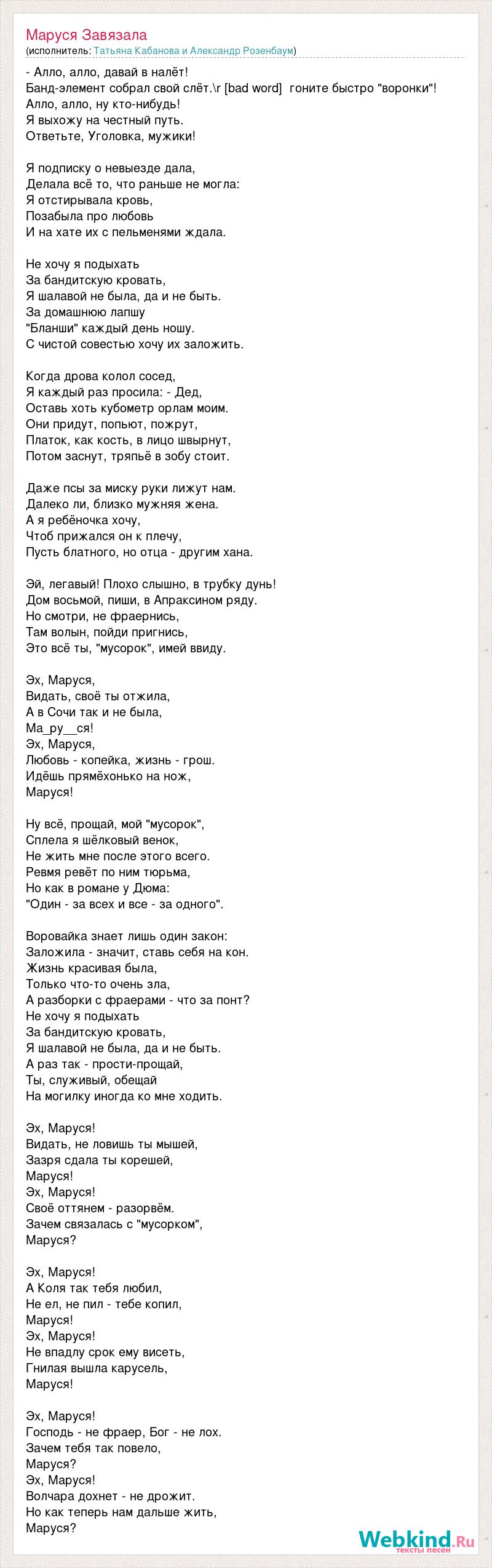 - Алло, алло, давай в налёт! Банд-элемент собрал свой слёт.\r [bad word] гоните быстро "воронки"! Алло, алло, ну кто-нибудь! Я выхожу на честный путь. Ответьте, Уголовка, мужики! Я подписку о невыезде дала, Делала всё то, что раньше не могла: Я отстирывала кровь, Позабыла про любовь И на хате их с пельменями ждала. Не хочу я подыхать За бандитскую кровать, Я шалавой не была, да и не быть. За домашнюю лапшу "Бланши" каждый день ношу. С чистой совестью хочу их заложить. Когда дрова колол сосед, Я каждый раз просила: - Дед, Оставь хоть кубометр орлам моим. Они придут, попьют, пожрут, Платок, как кость, в лицо швырнут, Потом заснут, тряпьё в зобу стоит. Даже псы за миску руки лижут нам. Далеко ли, близко мужняя жена. А я ребёночка хочу, Чтоб прижался он к плечу, Пусть блатного, но отца - другим хана. Эй, легавый! Плохо слышно, в трубку дунь! Дом восьмой, пиши, в Апраксином ряду. Но смотри, не фраернись, Там волын, пойди пригнись, Это всё ты, "мусорок", имей ввиду. Эх, Маруся, Видать, своё ты отжила, А в Сочи так и не была, Ма_ру__ся! Эх, Маруся, Любовь - копейка, жизнь - грош. Идёшь прямёхонько на нож, Маруся! Ну всё, прощай, мой "мусорок", Сплела я шёлковый венок, Не жить мне после этого всего. Ревмя ревёт по ним тюрьма, Но как в романе у Дюма: "Один - за всех и все - за одного". Воровайка знает лишь один закон: Заложила - значит, ставь себя на кон. Жизнь красивая была, Только что-то очень зла, А разборки с фраерами - что за понт? Не хочу я подыхать За бандитскую кровать, Я шалавой не была, да и не быть. А раз так - прости-прощай, Ты, служивый, обещай На могилку иногда ко мне ходить. Эх, Маруся! Видать, не ловишь ты мышей, Зазря сдала ты корешей, Маруся! Эх, Маруся! Своё оттянем - разорвём. Зачем связалась с "мусорком", Маруся? Эх, Маруся! А Коля так тебя любил, Не ел, не пил - тебе копил, Маруся! Эх, Маруся! Не впадлу срок ему висеть, Гнилая вышла карусель, Маруся! Эх, Маруся! Господь - не фраер, Бог - не лох. Зачем тебя так повело, Маруся? Эх, Маруся! Волчара дохнет - не дрожит. Но как теперь нам дальше жить, Маруся?