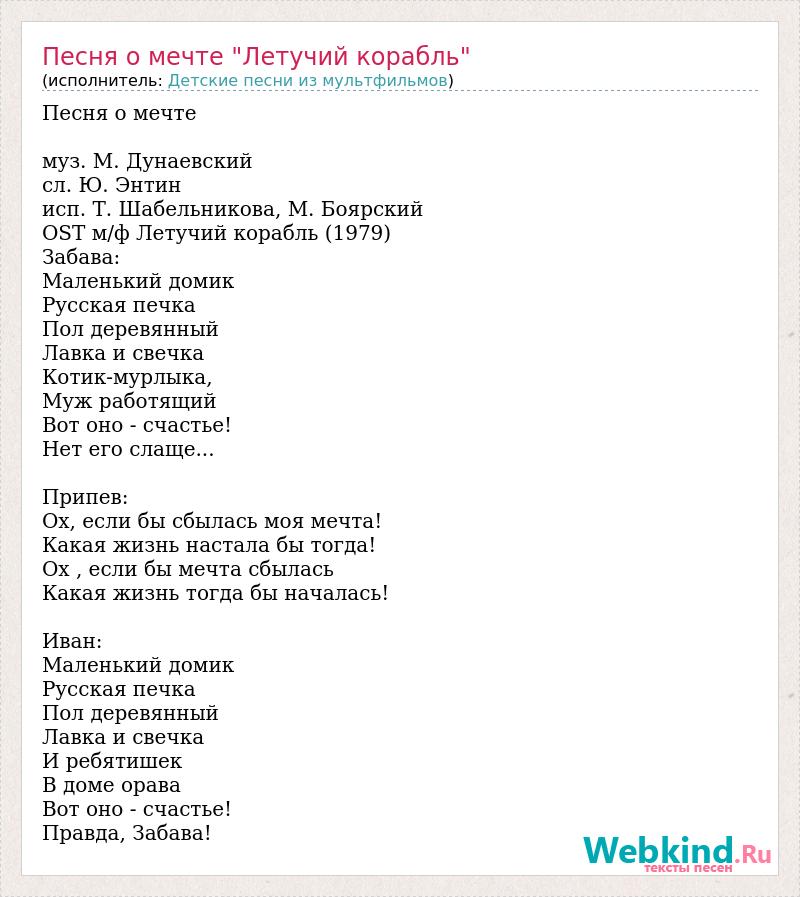 Песня о мечте муз. М. Дунаевский сл. Ю. Энтин исп. Т. Шабельникова, М. Боярский OST м/ф Летучий корабль (1979) Забава: Маленький домик Русская печка Пол деревянный Лавка и свечка Котик-мурлыка, Муж работящий Вот оно - счастье! Нет его слаще... Припев: Ох, если бы сбылась моя мечта! Какая жизнь настала бы тогда! Ох , если бы мечта сбылась Какая жизнь тогда бы началась! Иван: Маленький домик Русская печка Пол деревянный Лавка и свечка И ребятишек В доме орава Вот оно - счастье! Правда, Забава!