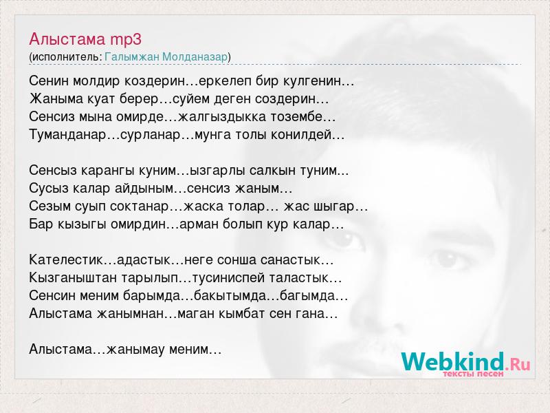 Сенин молдир коздерин…еркелеп бир кулгенин… Жаныма куат берер…суйем деген создерин… Сенсиз мына омирде…жалгыздыкка тозембе… Туманданар…сурланар…мунга толы конилдей… Сенсыз карангы куним…ызгарлы салкын туним... Сусыз калар айдыным…сенсиз жаным… Сезым суып соктанар…жаска толар… жас шыгар… Бар кызыгы омирдин…арман болып кур калар… Кателестик…адастык…неге сонша санастык… Кызганыштан тарылып…тусиниспей таластык… Сенсин меним барымда…бакытымда…багымда… Алыстама жанымнан…маган кымбат сен гана… Алыстама…жанымау меним…