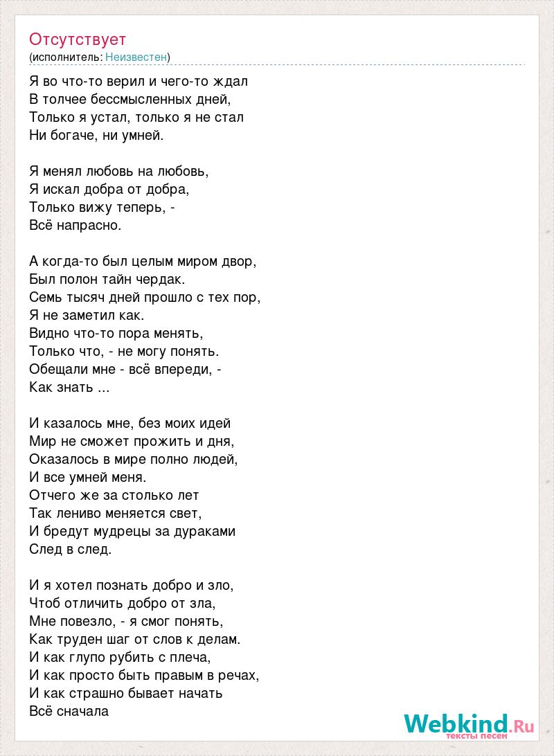 Я во что-то верил и чего-то ждал В толчее бессмысленных дней, Только я устал, только я не стал Ни богаче, ни умней. Я менял любовь на любовь, Я искал добра от добра, Только вижу теперь, - Всё напрасно. А когда-то был целым миром двор, Был полон тайн чердак. Семь тысяч дней прошло с тех пор, Я не заметил как. Видно что-то пора менять, Только что, - не могу понять. Обещали мне - всё впереди, - Как знать ... И казалось мне, без моих идей Мир не сможет прожить и дня, Оказалось в мире полно людей, И все умней меня. Отчего же за столько лет Так лениво меняется свет, И бредут мудрецы за дураками След в след. И я хотел познать добро и зло, Чтоб отличить добро от зла, Мне повезло, - я смог понять, Как труден шаг от слов к делам. И как глупо рубить с плеча, И как просто быть правым в речах, И как страшно бывает начать Всё сначала