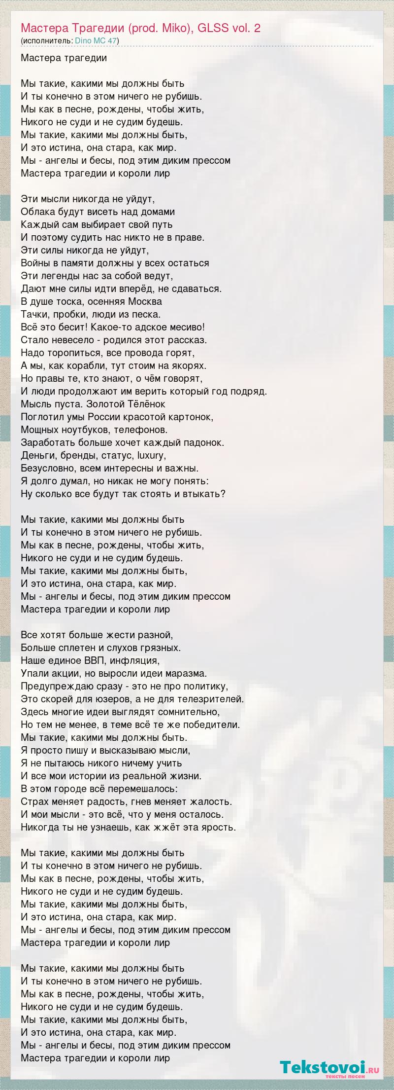 Мастера трагедии Мы такие, какими мы должны быть И ты конечно в этом ничего не рубишь. Мы как в песне, рождены, чтобы жить, Никого не суди и не судим будешь. Мы такие, какими мы должны быть, И это истина, она стара, как мир. Мы - ангелы и бесы, под этим диким прессом Мастера трагедии и короли лир Эти мысли никогда не уйдут, Облака будут висеть над домами Каждый сам выбирает свой путь И поэтому судить нас никто не в праве. Эти силы никогда не уйдут, Войны в памяти должны у всех остаться Эти легенды нас за собой ведут, Дают мне силы идти вперёд, не сдаваться. В душе тоска, осенняя Москва Тачки, пробки, люди из песка. Всё это бесит! Какое-то адское месиво! Стало невесело - родился этот рассказ. Надо торопиться, все провода горят, А мы, как корабли, тут стоим на якорях. Но правы те, кто знают, о чём говорят, И люди продолжают им верить который год подряд. Мысль пуста. Золотой Тёлёнок Поглотил умы России красотой картонок, Мощных ноутбуков, телефонов. Заработать больше хочет каждый падонок. Деньги, бренды, статус, luxury, Безусловно, всем интересны и важны. Я долго думал, но никак не могу понять: Ну сколько все будут так стоять и втыкать? Мы такие, какими мы должны быть И ты конечно в этом ничего не рубишь. Мы как в песне, рождены, чтобы жить, Никого не суди и не судим будешь. Мы такие, какими мы должны быть, И это истина, она стара, как мир. Мы - ангелы и бесы, под этим диким прессом Мастера трагедии и короли лир Все хотят больше жести разной, Больше сплетен и слухов грязных. Наше единое ВВП, инфляция, Упали акции, но выросли идеи маразма. Предупреждаю сразу - это не про политику, Это скорей для юзеров, а не для телезрителей. Здесь многие идеи выглядят сомнительно, Но тем не менее, в теме всё те же победители. Мы такие, какими мы должны быть. Я просто пишу и высказываю мысли, Я не пытаюсь никого ничему учить И все мои истории из реальной жизни. В этом городе всё перемешалось: Страх меняет радость, гнев меняет жалость. И мои мысли - это всё, что у меня осталось. Никогда ты не узнаешь, как жжёт эта ярость. Мы такие, какими мы должны быть И ты конечно в этом ничего не рубишь. Мы как в песне, рождены, чтобы жить, Никого не суди и не судим будешь. Мы такие, какими мы должны быть, И это истина, она стара, как мир. Мы - ангелы и бесы, под этим диким прессом Мастера трагедии и короли лир Мы такие, какими мы должны быть И ты конечно в этом ничего не рубишь. Мы как в песне, рождены, чтобы жить, Никого не суди и не судим будешь. Мы такие, какими мы должны быть, И это истина, она стара, как мир. Мы - ангелы и бесы, под этим диким прессом Мастера трагедии и короли лир