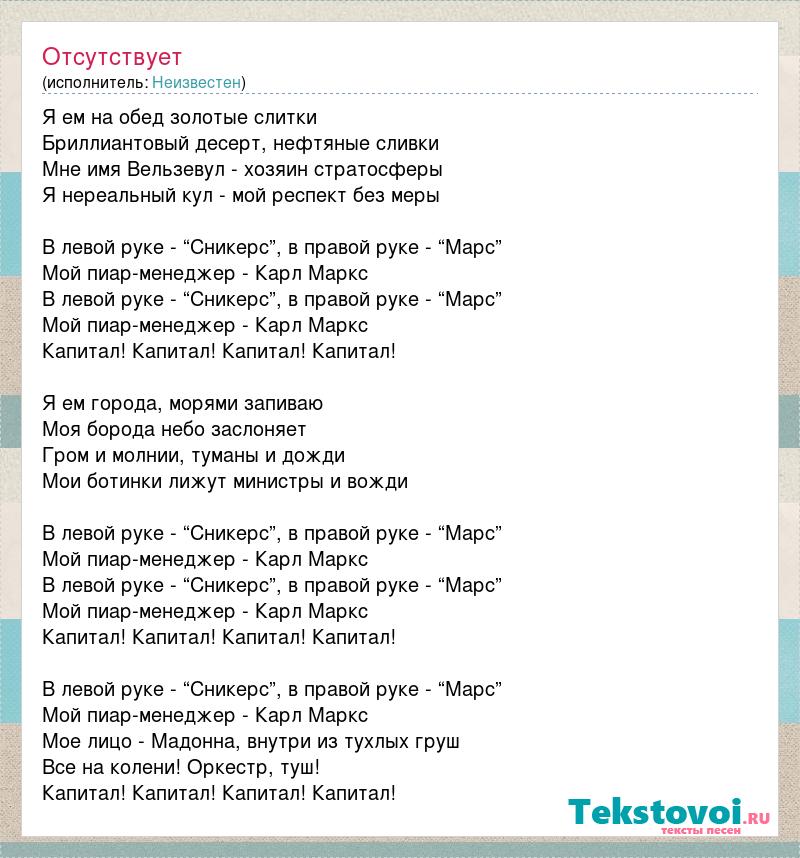 Я ем на обед золотые слитки Бриллиантовый десерт, нефтяные сливки Мне имя Вельзевул - хозяин стратосферы Я нереальный кул - мой респект без меры В левой руке - “Сникерс”, в правой руке - “Марс” Мой пиар-менеджер - Карл Маркс В левой руке - “Сникерс”, в правой руке - “Марс” Мой пиар-менеджер - Карл Маркс Капитал! Капитал! Капитал! Капитал! Я ем города, морями запиваю Моя борода небо заслоняет Гром и молнии, туманы и дожди Мои ботинки лижут министры и вожди В левой руке - “Сникерс”, в правой руке - “Марс” Мой пиар-менеджер - Карл Маркс В левой руке - “Сникерс”, в правой руке - “Марс” Мой пиар-менеджер - Карл Маркс Капитал! Капитал! Капитал! Капитал! В левой руке - “Сникерс”, в правой руке - “Марс” Мой пиар-менеджер - Карл Маркс Мое лицо - Мадонна, внутри из тухлых груш Все на колени! Оркестр, туш! Капитал! Капитал! Капитал! Капитал!
