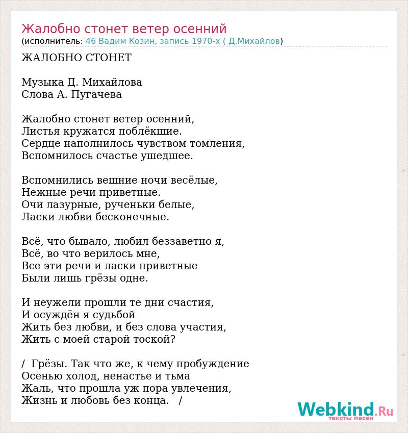 ЖАЛОБНО СТОНЕТ Музыка Д. Михайлова Слова А. Пугачева Жалобно стонет ветер осенний, Листья кружатся поблёкшие. Сердце наполнилось чувством томления, Вспомнилось счастье ушедшее. Вспомнились вешние ночи весёлые, Нежные речи приветные. Очи лазурные, рученьки белые, Ласки любви бесконечные. Всё, что бывало, любил беззаветно я, Всё, во что верилось мне, Все эти речи и ласки приветные Были лишь грёзы одне. И неужели прошли те дни счастия, И осуждён я судьбой Жить без любви, и без слова участия, Жить с моей старой тоской? / Грёзы. Так что же, к чему пробуждение Осенью холод, ненастье и тьма Жаль, что прошла уж пора увлечения, Жизнь и любовь без конца. /