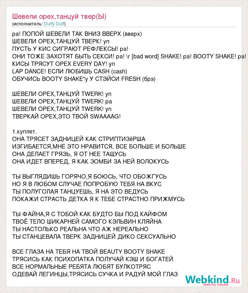 ра! ПОПОЙ ШЕВЕЛИ ТАК ВНИЗ ВВЕРХ (вверх) ШЕВЕЛИ ОРЕХ,ТАНЦУЙ ТВЕРК! уп ПУСТЬ У КИС СИГРАЮТ РЕФЛЕКСЫ! ра! ОНИ ТОЖЕ ЗАХОТЯТ БЫТЬ СЕКСИ! ра! \r [bad word] SHAKE! ра! BOOTY SHAKE! ра! КИСЫ ТРЯСУТ ОРЕХ EVERY DAY! уп LAP DANCE! ЕСЛИ ЛЮБИШЬ CASH (cash) ОБУЧИСЬ BOOTY SHAKE"у У СТЭЙСИ FRESH (брэ) ШЕВЕЛИ ОРЕХ,ТАНЦУЙ TWERK! уп ШЕВЕЛИ ОРЕХ,ТАНЦУЙ TWERK! ра ШЕВЕЛИ ОРЕХ,ТАНЦУЙ TWERK! уп ТВЕРКАЙ ОРЕХ,ЭТО ТВОЙ SWAAAAG! 1.куплет. ОНА ТРЯСЕТ ЗАДНИЦЕЙ КАК СТРИПТИЗёРША ИЗГИБАЕТСЯ,МНЕ ЭТО НРАВИТСЯ, ВСЕ БОЛЬШЕ И БОЛЬШЕ ОНА ДЕЛАЕТ ГРЯЗЬ, Я ОТ НЕЕ ТАЩУСЬ ОНА ИДЕТ ВПЕРЕД, Я КАК ЗОМБИ ЗА НЕЙ ВОЛОКУСЬ ТЫ ВЫГЛЯДИШЬ ГОРЯЧО,Я БОЮСЬ, ЧТО ОБОЖГУСЬ НО Я В ЛЮБОМ СЛУЧАЕ ПОПРОБУЮ ТЕБЯ НА ВКУС ТЫ ПОЛУГОЛАЯ ТАНЦУЕШЬ, Я НА ЭТО ВЕДУСЬ ПОКАЖИ СТРАСТЬ ДЕТКА Я К ТЕБЕ СТРАСТНО ПРИЖМУСЬ ТЫ ФАЙНА,Я С ТОБОЙ КАК БУДТО БЫ ПОД КАЙФОМ ТВОЁ ТЕЛО ШИКАРНЕЙ САМОГО КЭЛЬВИН КЛЯЙНА ТЫ НАСТОЛЬКО РЕАЛЬНА ЧТО АЖ НЕРЕАЛЬНО ТЫ СТАНЦЕВАЛА ТВЕРК ЗАДНИЦЕЙ ДИКО СЕКСУАЛЬНО ВСЕ ГЛАЗА НА ТЕБЯ НА ТВОЙ BEAUTY BOOTY SHAKE ТРЯСИСЬ КАК ПСИХОПАТКА ПОЛУЧАЙ КЭШ И БОГАТЕЙ ВСЕ НОРМАЛЬНЫЕ РЕБЯТА ЛЮБЯТ БУЛКОТРЯС ОДЕВАЙ ЛЕГИНЦЫ,ТРЯСИСЬ СУЧКА И РАДУЙ МОЙ ГЛАЗ