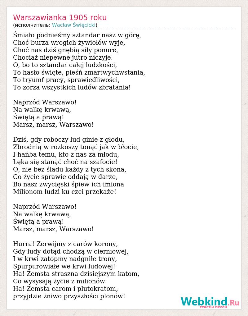 Śmiało podnieśmy sztandar nasz w górę, Choć burza wrogich żywiołów wyje, Choć nas dziś gnębią siły ponure, Chociaż niepewne jutro niczyje. O, bo to sztandar całej ludzkości, To hasło święte, pieśń zmartwychwstania, To tryumf pracy, sprawiedliwości, To zorza wszystkich ludów zbratania! Naprzód Warszawo! Na walkę krwawą, Świętą a prawą! Marsz, marsz, Warszawo! Dziś, gdy roboczy lud ginie z głodu, Zbrodnią w rozkoszy tonąć jak w błocie, I hańba temu, kto z nas za młodu, Lęka się stanąć choć na szafocie! O, nie bez śladu każdy z tych skona, Co życie sprawie oddają w darze, Bo nasz zwycięski śpiew ich imiona Milionom ludzi ku czci przekaże! Naprzód Warszawo! Na walkę krwawą, Świętą a prawą! Marsz, marsz, Warszawo! Hurra! Zerwijmy z carów korony, Gdy ludy dotąd chodzą w cierniowej, I w krwi zatopmy nadgniłe trony, Spurpurowiałe we krwi ludowej! Ha! Zemsta straszna dzisiejszym katom, Co wysysają życie z milionów. Ha! Zemsta carom i plutokratom, przyjdzie żniwo przyszłości plonów!