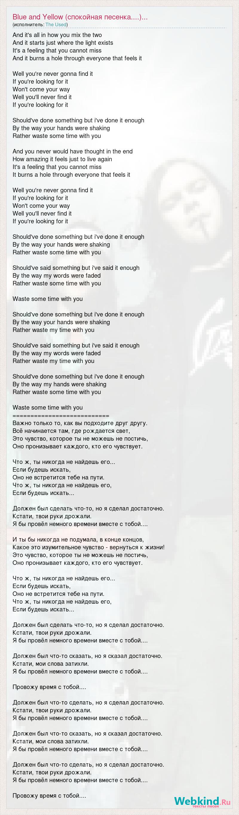 And it's all in how you mix the two And it starts just where the light exists It's a feeling that you cannot miss And it burns a hole through everyone that feels it Well you're never gonna find it If you're looking for it Won't come your way Well you'll never find it If you're looking for it Should've done something but i've done it enough By the way your hands were shaking Rather waste some time with you And you never would have thought in the end How amazing it feels just to live again It's a feeling that you cannot miss It burns a hole through everyone that feels it Well you're never gonna find it If you're looking for it Won't come your way Well you'll never find it If you're looking for it Should've done something but i've done it enough By the way your hands were shaking Rather waste some time with you Should've said something but i've said it enough By the way my words were faded Rather waste some time with you Waste some time with you Should've done something but i've done it enough By the way your hands were shaking Rather waste my time with you Should've said something but i've said it enough By the way my words were faded Rather waste my time with you Should've done something but i've done it enough By the way my hands were shaking Rather waste some time with you Waste some time with you =========================== Важно только то, как вы подходите друг другу. Всё начинается там, где рождается свет, Это чувство, которое ты не можешь не постичь, Оно пронизывает каждого, кто его чувствует. Что ж, ты никогда не найдешь его... Если будешь искать, Оно не встретится тебе на пути. Что ж, ты никогда не найдешь его, Если будешь искать... Должен был сделать что-то, но я сделал достаточно. Кстати, твои руки дрожали. Я бы провёл немного времени вместе с тобой.... И ты бы никогда не подумала, в конце концов, Какое это изумительное чувство - вернуться к жизни! Это чувство, которое ты не можешь не постичь, Оно пронизывает каждого, кто его чувствует. Что ж, ты никогда не найдешь его... Если будешь искать, Оно не встретится тебе на пути. Что ж, ты никогда не найдешь его, Если будешь искать... Должен был сделать что-то, но я сделал достаточно. Кстати, твои руки дрожали. Я бы провёл немного времени вместе с тобой.... Должен был что-то сказать, но я сказал достаточно. Кстати, мои слова затихли. Я бы провёл немного времени вместе с тобой.... Провожу время с тобой.... Должен был что-то сделать, но я сделал достаточно. Кстати, твои руки дрожали. Я бы провёл немного времени вместе с тобой.... Должен был что-то сказать, но я сказал достаточно. Кстати, мои слова затихли. Я бы провёл немного времени вместе с тобой.... Должен был что-то сделать, но я сделал достаточно. Кстати, твои руки дрожали. Я бы провёл немного времени вместе с тобой.... Провожу время с тобой....