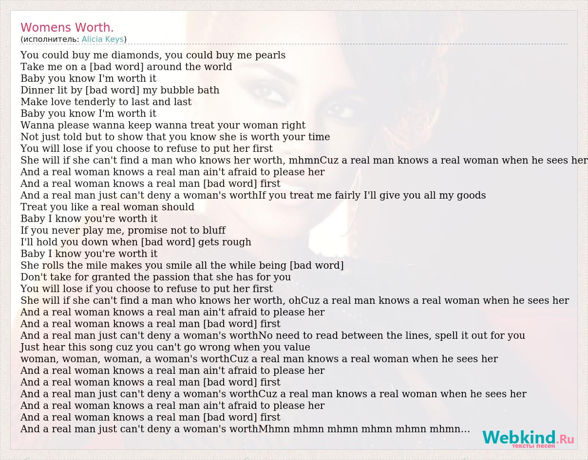 You could buy me diamonds, you could buy me pearls Take me on a [bad word] around the world Baby you know I'm worth it Dinner lit by [bad word] my bubble bath Make love tenderly to last and last Baby you know I'm worth it Wanna please wanna keep wanna treat your woman right Not just told but to show that you know she is worth your time You will lose if you choose to refuse to put her first She will if she can't find a man who knows her worth, mhmnCuz a real man knows a real woman when he sees her And a real woman knows a real man ain't afraid to please her And a real woman knows a real man [bad word] first And a real man just can't deny a woman's worthIf you treat me fairly I'll give you all my goods Treat you like a real woman should Baby I know you're worth it If you never play me, promise not to bluff I'll hold you down when [bad word] gets rough Baby I know you're worth it She rolls the mile makes you smile all the while being [bad word] Don't take for granted the passion that she has for you You will lose if you choose to refuse to put her first She will if she can't find a man who knows her worth, ohCuz a real man knows a real woman when he sees her And a real woman knows a real man ain't afraid to please her And a real woman knows a real man [bad word] first And a real man just can't deny a woman's worthNo need to read between the lines, spell it out for you Just hear this song cuz you can't go wrong when you value woman, woman, woman, a woman's worthCuz a real man knows a real woman when he sees her And a real woman knows a real man ain't afraid to please her And a real woman knows a real man [bad word] first And a real man just can't deny a woman's worthCuz a real man knows a real woman when he sees her And a real woman knows a real man ain't afraid to please her And a real woman knows a real man [bad word] first And a real man just can't deny a woman's worthMhmn mhmn mhmn mhmn mhmn mhmn…