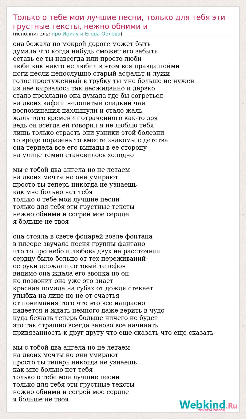 она бежала по мокрой дороге может быть думала что когда нибудь сможет его забыть оставь ее ты навсегда или просто люби люби как никто не любил в этом вся правда пойми ноги несли непослушно старый асфальт и лужи голос простуженный в трубку ты мне больше не нужен из нее вырвалось так неожиданно и дерзко стало прохладно она думала где бы согреться на двоих кафе и недопитый сладкий чай воспоминания нахлынули и стало жаль жаль того времени потраченного как-то зря ведь он всегда ей говорил я не люблю тебя лишь только страсть они узники этой болезни то вроде поразень то вместе знакомы с детства она терпела все его выпады в ее сторону на улице темно становилось холодно мы с тобой два ангела но не летаем на двоих мечты но они умирают просто ты теперь никогда не узнаешь как мне больно нет тебя только о тебе мои лучшие песни только для тебя эти грустные тексты нежно обними и согрей мое сердце я больше не твоя она стояла в свете фонарей возле фонтана в плеере звучала песня группы фантано что то про небо и любовь двух на расстоянии сердцу было больно от тех переживаний ее руки держали сотовый телефон видимо она ждала его звонка но он не позвонит она уже это знает красная помада на губах от дождя стекает улыбка на лице но не от счастья от понимания того что это все напрасно надеется и ждать немного даже верить в чудо куда бежать теперь больше ничего не будет это так страшно всегда заново все начинать привязанность к друг другу что еще сказать что еще сказать мы с тобой два ангела но не летаем на двоих мечты но они умирают просто ты теперь никогда не узнаешь как мне больно нет тебя только о тебе мои лучшие песни только для тебя эти грустные тексты нежно обними и согрей мое сердце я больше не твоя