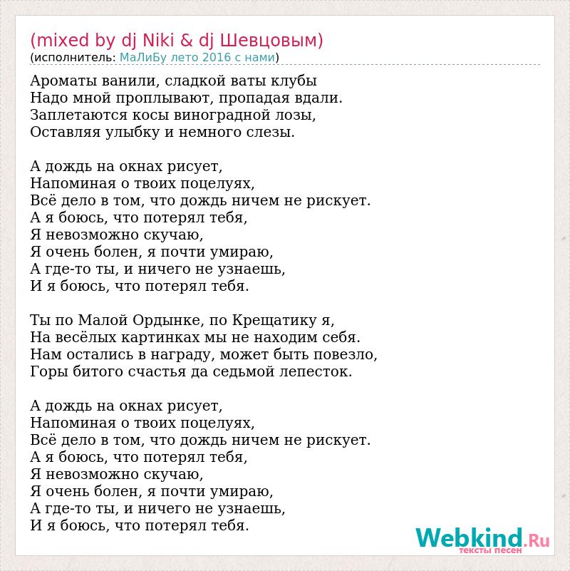 Ароматы ванили, сладкой ваты клубы Надо мной проплывают, пропадая вдали. Заплетаются косы виноградной лозы, Оставляя улыбку и немного слезы. А дождь на окнах рисует, Напоминая о твоих поцелуях, Всё дело в том, что дождь ничем не рискует. А я боюсь, что потерял тебя, Я невозможно скучаю, Я очень болен, я почти умираю, А где-то ты, и ничего не узнаешь, И я боюсь, что потерял тебя. Ты по Малой Ордынке, по Крещатику я, На весёлых картинках мы не находим себя. Нам остались в награду, может быть повезло, Горы битого счастья да седьмой лепесток. А дождь на окнах рисует, Напоминая о твоих поцелуях, Всё дело в том, что дождь ничем не рискует. А я боюсь, что потерял тебя, Я невозможно скучаю, Я очень болен, я почти умираю, А где-то ты, и ничего не узнаешь, И я боюсь, что потерял тебя.