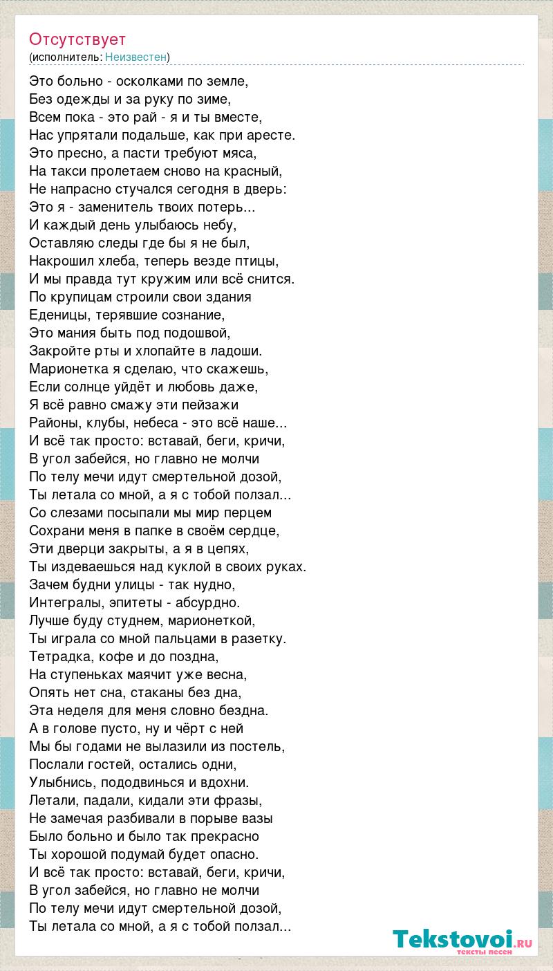 Это больно - осколками по земле, Без одежды и за руку по зиме, Всем пока - это рай - я и ты вместе, Нас упрятали подальше, как при аресте. Это пресно, а пасти требуют мяса, На такси пролетаем сново на красный, Не напрасно стучался сегодня в дверь: Это я - заменитель твоих потерь... И каждый день улыбаюсь небу, Оставляю следы где бы я не был, Накрошил хлеба, теперь везде птицы, И мы правда тут кружим или всё снится. По крупицам строили свои здания Еденицы, терявшие сознание, Это мания быть под подошвой, Закройте рты и хлопайте в ладоши. Марионетка я сделаю, что скажешь, Если солнце уйдёт и любовь даже, Я всё равно смажу эти пейзажи Районы, клубы, небеса - это всё наше... И всё так просто: вставай, беги, кричи, В угол забейся, но главно не молчи По телу мечи идут смертельной дозой, Ты летала со мной, а я с тобой ползал... Со слезами посыпали мы мир перцем Сохрани меня в папке в своём сердце, Эти дверци закрыты, а я в цепях, Ты издеваешься над куклой в своих руках. Зачем будни улицы - так нудно, Интегралы, эпитеты - абсурдно. Лучше буду студнем, марионеткой, Ты играла со мной пальцами в разетку. Тетрадка, кофе и до поздна, На ступеньках маячит уже весна, Опять нет сна, стаканы без дна, Эта неделя для меня словно бездна. А в голове пусто, ну и чёрт с ней Мы бы годами не вылазили из постель, Послали гостей, остались одни, Улыбнись, пододвинься и вдохни. Летали, падали, кидали эти фразы, Не замечая разбивали в порыве вазы Было больно и было так прекрасно Ты хорошой подумай будет опасно. И всё так просто: вставай, беги, кричи, В угол забейся, но главно не молчи По телу мечи идут смертельной дозой, Ты летала со мной, а я с тобой ползал...