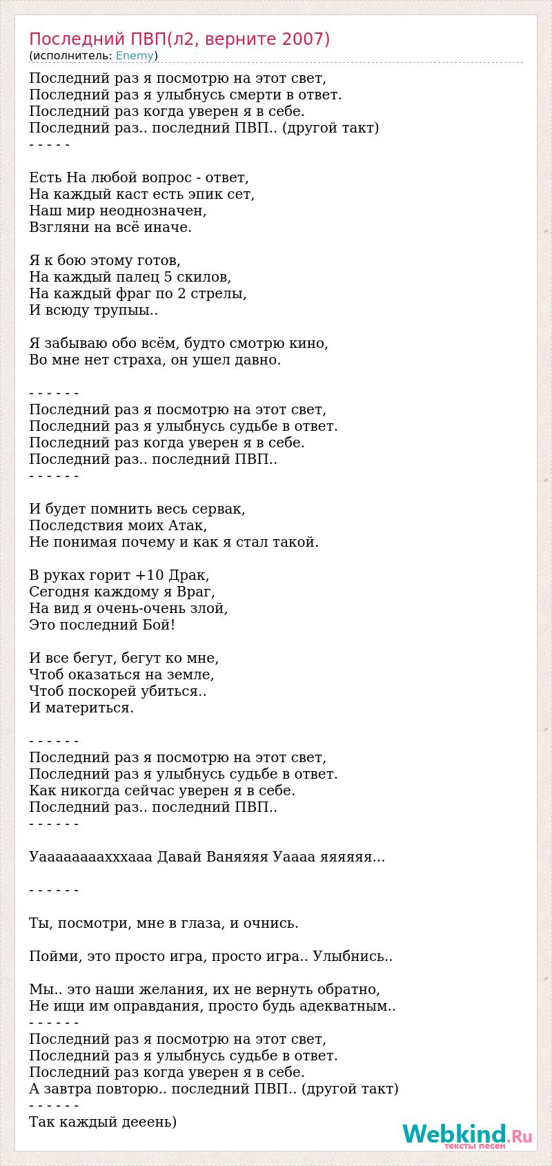 Последний раз я посмотрю на этот свет, Последний раз я улыбнусь смерти в ответ. Последний раз когда уверен я в себе. Последний раз.. последний ПВП.. (другой такт) - - - - - Есть На любой вопрос - ответ, На каждый каст есть эпик сет, Наш мир неоднозначен, Взгляни на всё иначе. Я к бою этому готов, На каждый палец 5 скилов, На каждый фраг по 2 стрелы, И всюду трупыы.. Я забываю обо всём, будто смотрю кино, Во мне нет страха, он ушел давно. - - - - - - Последний раз я посмотрю на этот свет, Последний раз я улыбнусь судьбе в ответ. Последний раз когда уверен я в себе. Последний раз.. последний ПВП.. - - - - - - И будет помнить весь сервак, Последствия моих Атак, Не понимая почему и как я стал такой. В руках горит +10 Драк, Сегодня каждому я Враг, На вид я очень-очень злой, Это последний Бой! И все бегут, бегут ко мне, Чтоб оказаться на земле, Чтоб поскорей убиться.. И материться. - - - - - - Последний раз я посмотрю на этот свет, Последний раз я улыбнусь судьбе в ответ. Как никогда сейчас уверен я в себе. Последний раз.. последний ПВП.. - - - - - - Уаааааааахххааа Давай Ваняяяя Уаааа яяяяяя... - - - - - - Ты, посмотри, мне в глаза, и очнись. Пойми, это просто игра, просто игра.. Улыбнись.. Мы.. это наши желания, их не вернуть обратно, Не ищи им оправдания, просто будь адекватным.. - - - - - - Последний раз я посмотрю на этот свет, Последний раз я улыбнусь судьбе в ответ. Последний раз когда уверен я в себе. А завтра повторю.. последний ПВП.. (другой такт) - - - - - - Так каждый дееень)