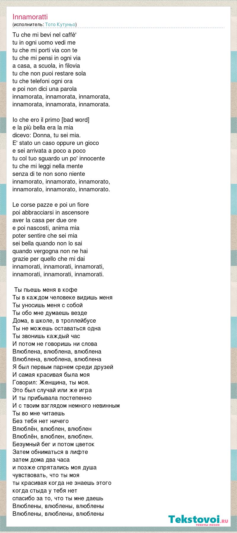 Tu che mi bevi nel caffè' tu in ogni uomo vedi me tu che mi porti via con te tu che mi pensi in ogni via a casa, a scuola, in filovia tu che non puoi restare sola tu che telefoni ogni ora e poi non dici una parola innamorata, innamorata, innamorata, innamorata, innamorata, innamorata. Io che ero il primo in compagnia e la più bella era la mia dicevo: Donna, tu sei mia. E' stato un caso oppure un gioco e sei arrivata a poco a poco tu col tuo sguardo un po' innocente tu che mi leggi nella mente senza di te non sono niente innamorato, innamorato, innamorato, innamorato, innamorato, innamorato. Le corse pazze e poi un fiore poi abbracciarsi in ascensore aver la casa per due ore e poi nascosti, anima mia poter sentire che sei mia sei bella quando non lo sai quando vergogna non ne hai grazie per quello che mi dai innamorati, innamorati, innamorati, innamorati, innamorati, innamorati. Ты пьешь меня в кофе Ты в каждом человеке видишь меня Ты уносишь меня с собой Ты обо мне думаешь везде Дома, в школе, в троллейбусе Ты не можешь оставаться одна Ты звонишь каждый час И потом не говоришь ни слова Влюблена, влюблена, влюблена Влюблена, влюблена, влюблена Я был первым парнем среди друзей И самая красивая была моя Говорил: Женщина, ты моя. Это был случай или же игра И ты прибывала постепенно И с твоим взглядом немного невинным Ты во мне читаешь Без тебя нет ничего Влюблён, влюблен, влюблен Влюблён, влюблен, влюблен. Безумный бег и потом цветок Затем обниматься в лифте затем дома два часа и позже спрятались моя душа чувствовать, что ты моя ты красивая когда не знаешь этого когда стыда у тебя нет спасибо за то, что ты мне даешь Влюблены, влюблены, влюблены Влюблены, влюблены, влюблены