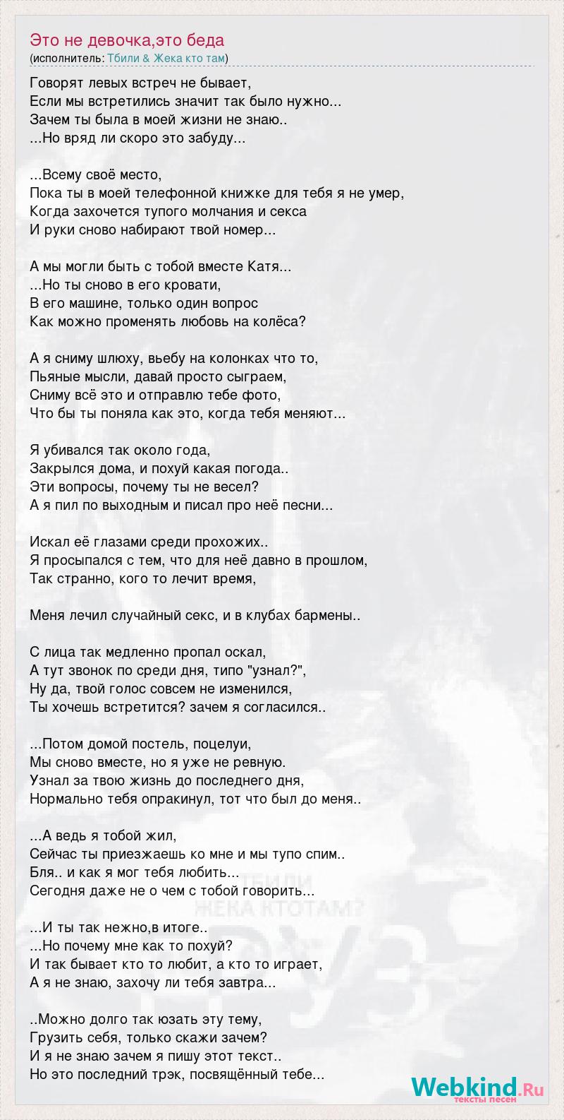 Говорят левых встреч не бывает, Если мы встретились значит так было нужно... Зачем ты была в моей жизни не знаю.. ...Но вряд ли скоро это забуду... ...Всему своё место, Пока ты в моей телефонной книжке для тебя я не умер, Когда захочется тупого молчания и секса И руки сново набирают твой номер... А мы могли быть с тобой вместе Катя... ...Но ты сново в его кровати, В его машине, только один вопрос Как можно променять любовь на колёса? А я сниму шлюху, вьебу на колонках что то, Пьяные мысли, давай просто сыграем, Сниму всё это и отправлю тебе фото, Что бы ты поняла как это, когда тебя меняют... Я убивался так около года, Закрылся дома, и похуй какая погода.. Эти вопросы, почему ты не весел? А я пил по выходным и писал про неё песни... Искал её глазами среди прохожих.. Я просыпался с тем, что для неё давно в прошлом, Так странно, кого то лечит время, Меня лечил случайный секс, и в клубах бармены.. С лица так медленно пропал оскал, А тут звонок по среди дня, типо "узнал?", Ну да, твой голос совсем не изменился, Ты хочешь встретится? зачем я согласился.. ...Потом домой постель, поцелуи, Мы сново вместе, но я уже не ревную. Узнал за твою жизнь до последнего дня, Нормально тебя опракинул, тот что был до меня.. ...А ведь я тобой жил, Сейчас ты приезжаешь ко мне и мы тупо спим.. Бля.. и как я мог тебя любить... Сегодня даже не о чем с тобой говорить... ...И ты так нежно,в итоге.. ...Но почему мне как то похуй? И так бывает кто то любит, а кто то играет, А я не знаю, захочу ли тебя завтра... ..Можно долго так юзать эту тему, Грузить себя, только скажи зачем? И я не знаю зачем я пишу этот текст.. Но это последний трэк, посвящённый тебе...