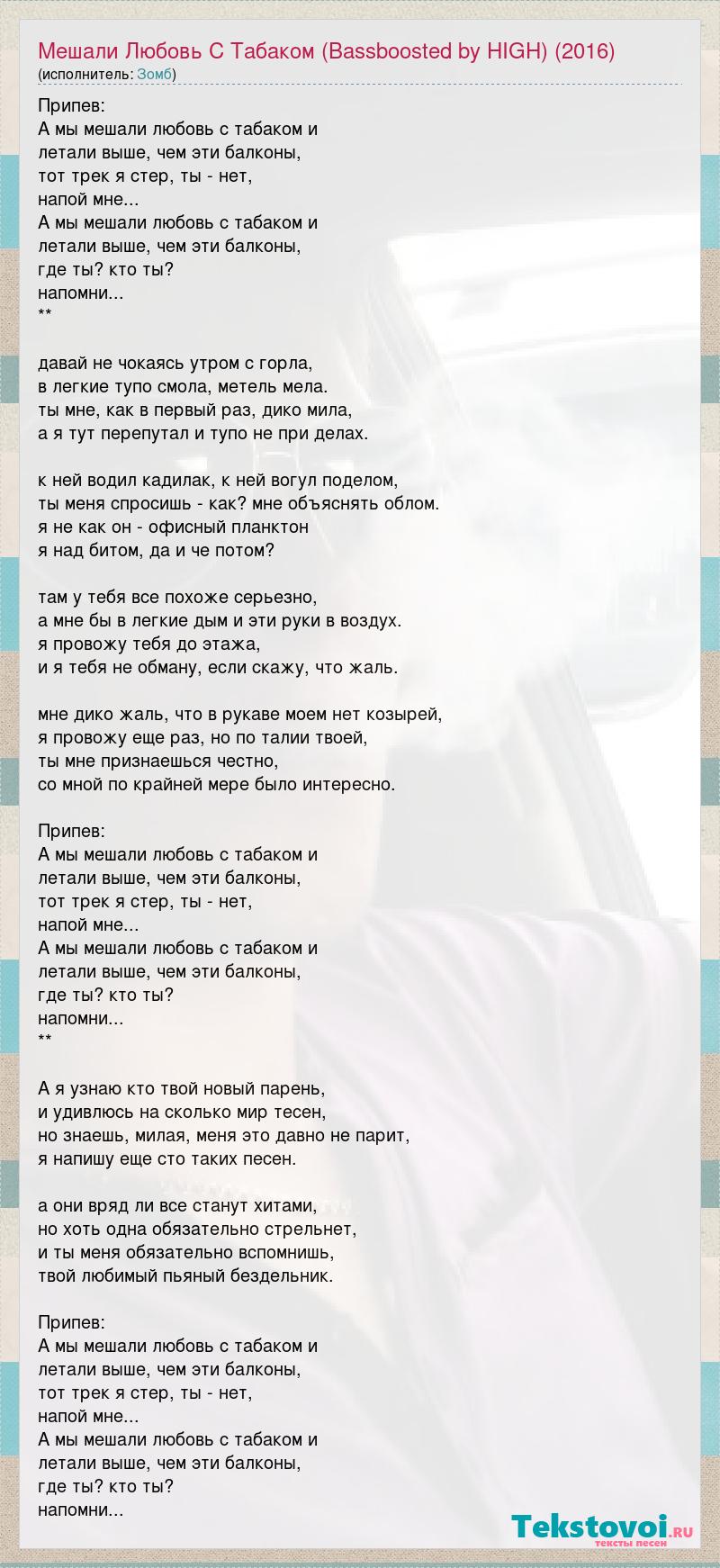Припев: А мы мешали любовь с табаком и летали выше, чем эти балконы, тот трек я стер, ты - нет, напой мне... А мы мешали любовь с табаком и летали выше, чем эти балконы, где ты? кто ты? напомни... ** давай не чокаясь утром с горла, в легкие тупо смола, метель мела. ты мне, как в первый раз, дико мила, а я тут перепутал и тупо не при делах. к ней водил кадилак, к ней вогул поделом, ты меня спросишь - как? мне объяснять облом. я не как он - офисный планктон я над битом, да и че потом? там у тебя все похоже серьезно, а мне бы в легкие дым и эти руки в воздух. я провожу тебя до этажа, и я тебя не обману, если скажу, что жаль. мне дико жаль, что в рукаве моем нет козырей, я провожу еще раз, но по талии твоей, ты мне признаешься честно, со мной по крайней мере было интересно. Припев: А мы мешали любовь с табаком и летали выше, чем эти балконы, тот трек я стер, ты - нет, напой мне... А мы мешали любовь с табаком и летали выше, чем эти балконы, где ты? кто ты? напомни... ** А я узнаю кто твой новый парень, и удивлюсь на сколько мир тесен, но знаешь, милая, меня это давно не парит, я напишу еще сто таких песен. а они вряд ли все станут хитами, но хоть одна обязательно стрельнет, и ты меня обязательно вспомнишь, твой любимый пьяный бездельник. Припев: А мы мешали любовь с табаком и летали выше, чем эти балконы, тот трек я стер, ты - нет, напой мне... А мы мешали любовь с табаком и летали выше, чем эти балконы, где ты? кто ты? напомни...