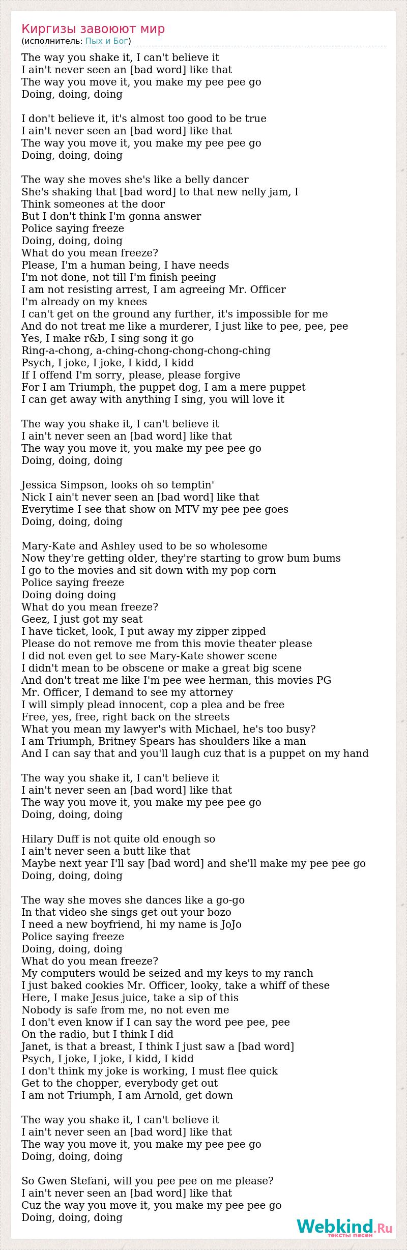 The way you shake it, I can't believe it I ain't never seen an [bad word] like that The way you move it, you make my pee pee go Doing, doing, doing I don't believe it, it's almost too good to be true I ain't never seen an [bad word] like that The way you move it, you make my pee pee go Doing, doing, doing The way she moves she's like a belly dancer She's shaking that [bad word] to that new nelly jam, I Think someones at the door But I don't think I'm gonna answer Police saying freeze Doing, doing, doing What do you mean freeze? Please, I'm a human being, I have needs I'm not done, not till I'm finish peeing I am not resisting arrest, I am agreeing Mr. Officer I'm already on my knees I can't get on the ground any further, it's impossible for me And do not treat me like a murderer, I just like to pee, pee, pee Yes, I make r&b, I sing song it go Ring-a-chong, a-ching-chong-chong-chong-ching Psych, I joke, I joke, I kidd, I kidd If I offend I'm sorry, please, please forgive For I am Triumph, the puppet dog, I am a mere puppet I can get away with anything I sing, you will love it The way you shake it, I can't believe it I ain't never seen an [bad word] like that The way you move it, you make my pee pee go Doing, doing, doing Jessica Simpson, looks oh so temptin' Nick I ain't never seen an [bad word] like that Everytime I see that show on MTV my pee pee goes Doing, doing, doing Mary-Kate and Ashley used to be so wholesome Now they're getting older, they're starting to grow bum bums I go to the movies and sit down with my pop corn Police saying freeze Doing doing doing What do you mean freeze? Geez, I just got my seat I have ticket, look, I put away my zipper zipped Please do not remove me from this movie theater please I did not even get to see Mary-Kate shower scene I didn't mean to be obscene or make a great big scene And don't treat me like I'm pee wee herman, this movies PG Mr. Officer, I demand to see my attorney I will simply plead innocent, cop a plea and be free Free, yes, free, right back on the streets What you mean my lawyer's with Michael, he's too busy? I am Triumph, Britney Spears has shoulders like a man And I can say that and you'll laugh cuz that is a puppet on my hand The way you shake it, I can't believe it I ain't never seen an [bad word] like that The way you move it, you make my pee pee go Doing, doing, doing Hilary Duff is not quite old enough so I ain't never seen a butt like that Maybe next year I'll say [bad word] and she'll make my pee pee go Doing, doing, doing The way she moves she dances like a go-go In that video she sings get out your bozo I need a new boyfriend, hi my name is JoJo Police saying freeze Doing, doing, doing What do you mean freeze? My computers would be seized and my keys to my ranch I just baked cookies Mr. Officer, looky, take a whiff of these Here, I make Jesus juice, take a sip of this Nobody is safe from me, no not even me I don't even know if I can say the word pee pee, pee On the radio, but I think I did Janet, is that a breast, I think I just saw a [bad word] Psych, I joke, I joke, I kidd, I kidd I don't think my joke is working, I must flee quick Get to the chopper, everybody get out I am not Triumph, I am Arnold, get down The way you shake it, I can't believe it I ain't never seen an [bad word] like that The way you move it, you make my pee pee go Doing, doing, doing So Gwen Stefani, will you pee pee on me please? I ain't never seen an [bad word] like that Cuz the way you move it, you make my pee pee go Doing, doing, doing
