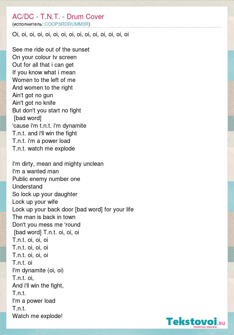 Oi, oi, oi, oi, oi, oi, oi, oi, oi, oi, oi, oi, oi, oi, oi See me ride out of the sunset On your colour tv screen Out for all that i can get If you know what i mean Women to the left of me And women to the right Ain't got no gun Ain't got no knife But don't you start no fight Chorus: 'cause i'm t.n.t. i'm dynamite T.n.t. and i'll win the fight T.n.t. i'm a power load T.n.t. watch me explode I'm dirty, mean and mighty unclean I'm a wanted man Public enemy number one Understand So lock up your daughter Lock up your wife Lock up your back door And run for your life The man is back in town Don't you mess me 'round Chorus T.n.t. oi, oi, oi T.n.t. oi, oi, oi T.n.t. oi, oi, oi T.n.t. oi, oi, oi T.n.t. oi I'm dynamite (oi, oi) T.n.t. oi, And i'll win the fight, T.n.t. I'm a power load T.n.t. Watch me explode!