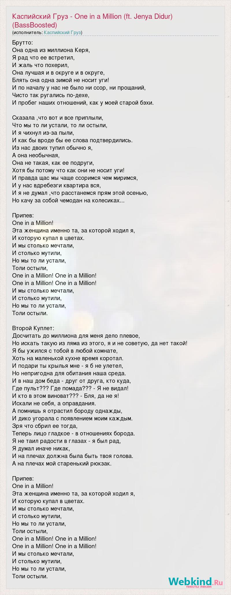 Брутто: Она одна из миллиона Керя, Я рад что ее встретил, И жаль что похерил, Она лучшая и в округе и в округе, Блять она одна зимой не носит уги! И по началу у нас не было ни ссор, ни прощаний, Чисто так ругались по-дехе, И пробег наших отношений, как у моей старой бэхи. Сказала ,что вот и все приплыли, Что мы то ли устали, то ли остыли, И я чихнул из-за пыли, И как бы вроде бы ее слова подтвердились. Из нас двоих тупил обычно я, А она необычная, Она не такая, как ее подруги, Хотя бы потому что как они не носит уги! И правда щас мы чаще ссоримся чем миримся, И у нас вдребезги квартира вся, И я не думал ,что расстанемся прям этой осенью, Но качу за собой чемодан на колесиках... Припев: One in a Million! Эта женщина именно та, за которой ходил я, И которую купал в цветах. И мы столько мечтали, И столько мутили, Но мы то ли устали, Толи остыли, One in a Million! One in a Million! One in a Million! One in a Million! И мы столько мечтали, И столько мутили, Но мы то ли устали, Толи остыли. Второй Куплет: Досчитать до миллиона для меня дело плевое, Но искать такую из ляма из этого, я и не советую, да нет такой! Я бы ужился с тобой в любой комнате, Хоть на маленькой кухне время коротал. И подари ты крылья мне - я б не улетел, Но непригодна для обитания наша среда. И в наш дом беда - друг от друга, кто куда, Где пульт??? Где помада??? - Я не видал! И кто в этом виноват??? - Бля, да не я! Искали не себя, а оправдания. А помнишь я отрастил бороду однажды, И дико угорала с появлением моим каждым. Зря что сбрил ее тогда, Теперь лицо гладкое - в отношениях борода. Я не таил радости в глазах - я был рад, Я думал иначе никак, И на плечах должна была быть твоя голова. А на плечах мой старенький рюкзак. Припев: One in a Million! Эта женщина именно та, за которой ходил я, И которую купал в цветах. И мы столько мечтали, И столько мутили, Но мы то ли устали, Толи остыли, One in a Million! One in a Million! One in a Million! One in a Million! И мы столько мечтали, И столько мутили, Но мы то ли устали, Толи остыли.