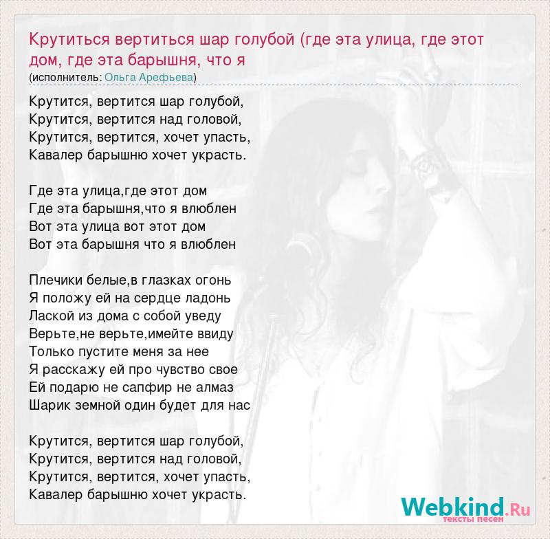 Главная→Исполнители→Ольга Арефьева→Крутиться вертиться шар голубой (где эта улица, где этот дом, где эта бары