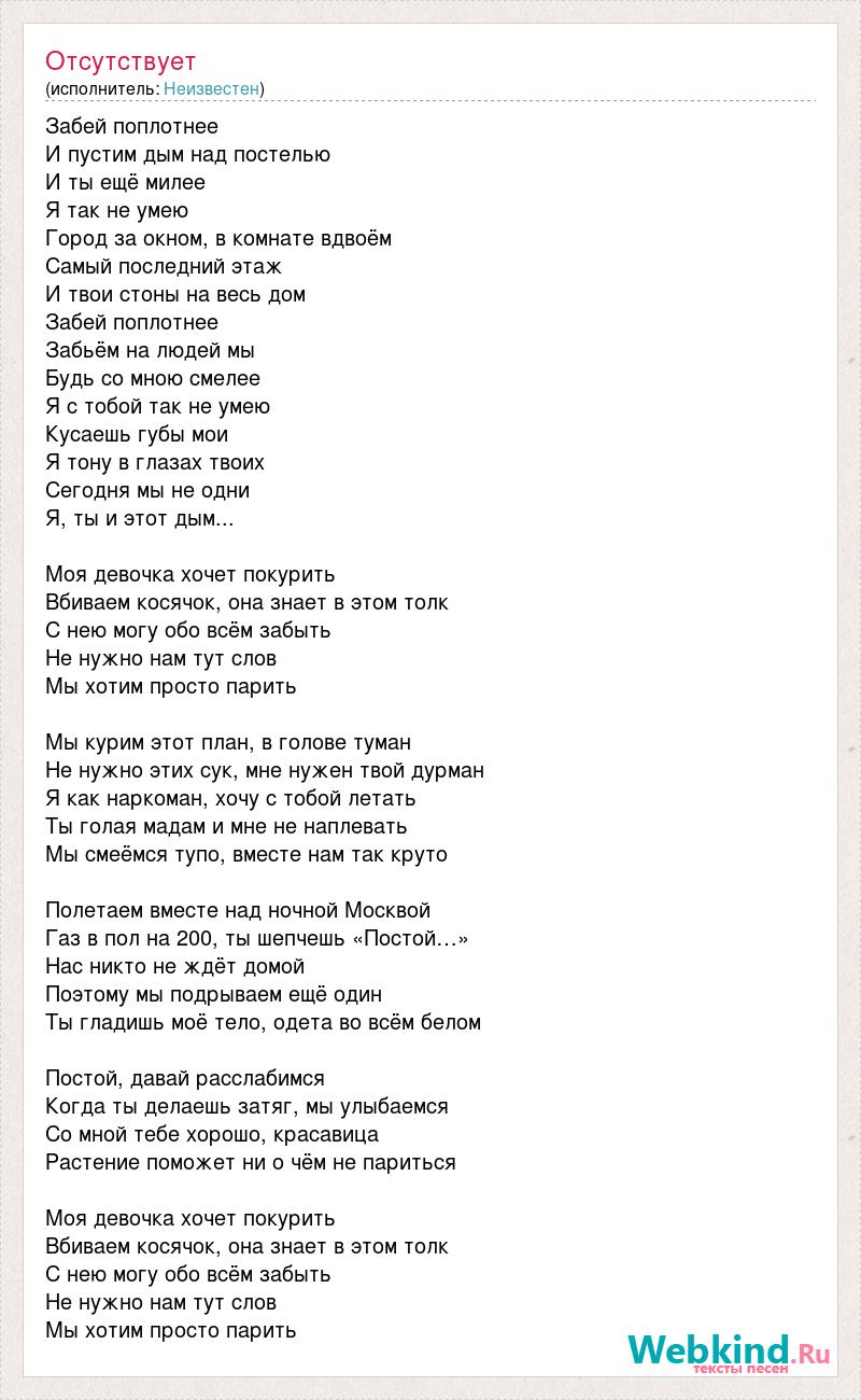 Забей поплотнее И пустим дым над постелью И ты ещё милее Я так не умею Город за окном, в комнате вдвоём Самый последний этаж И твои стоны на весь дом Забей поплотнее Забьём на людей мы Будь со мною смелее Я с тобой так не умею Кусаешь губы мои Я тону в глазах твоих Сегодня мы не одни Я, ты и этот дым... Моя девочка хочет покурить Вбиваем косячок, она знает в этом толк С нею могу обо всём забыть Не нужно нам тут слов Мы хотим просто парить Мы курим этот план, в голове туман Не нужно этих сук, мне нужен твой дурман Я как наркоман, хочу с тобой летать Ты голая мадам и мне не наплевать Мы смеёмся тупо, вместе нам так круто Полетаем вместе над ночной Москвой Газ в пол на 200, ты шепчешь «Постой…» Нас никто не ждёт домой Поэтому мы подрываем ещё один Ты гладишь моё тело, одета во всём белом Постой, давай расслабимся Когда ты делаешь затяг, мы улыбаемся Со мной тебе хорошо, красавица Растение поможет ни о чём не париться Моя девочка хочет покурить Вбиваем косячок, она знает в этом толк С нею могу обо всём забыть Не нужно нам тут слов Мы хотим просто парить