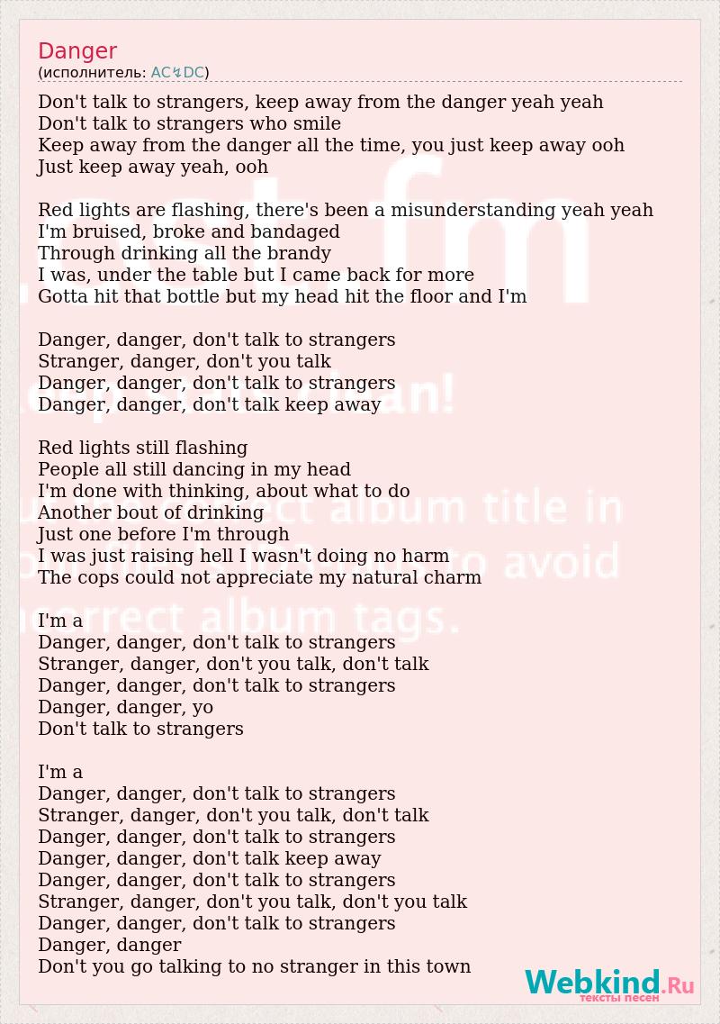 Don't talk to strangers, keep away from the danger yeah yeah Don't talk to strangers who smile Keep away from the danger all the time, you just keep away ooh Just keep away yeah, ooh Red lights are flashing, there's been a misunderstanding yeah yeah I'm bruised, broke and bandaged Through drinking all the brandy I was, under the table but I came back for more Gotta hit that bottle but my head hit the floor and I'm Danger, danger, don't talk to strangers Stranger, danger, don't you talk Danger, danger, don't talk to strangers Danger, danger, don't talk keep away Red lights still flashing People all still dancing in my head I'm done with thinking, about what to do Another bout of drinking Just one before I'm through I was just raising hell I wasn't doing no harm The cops could not appreciate my natural charm I'm a Danger, danger, don't talk to strangers Stranger, danger, don't you talk, don't talk Danger, danger, don't talk to strangers Danger, danger, yo Don't talk to strangers I'm a Danger, danger, don't talk to strangers Stranger, danger, don't you talk, don't talk Danger, danger, don't talk to strangers Danger, danger, don't talk keep away Danger, danger, don't talk to strangers Stranger, danger, don't you talk, don't you talk Danger, danger, don't talk to strangers Danger, danger Don't you go talking to no stranger in this town