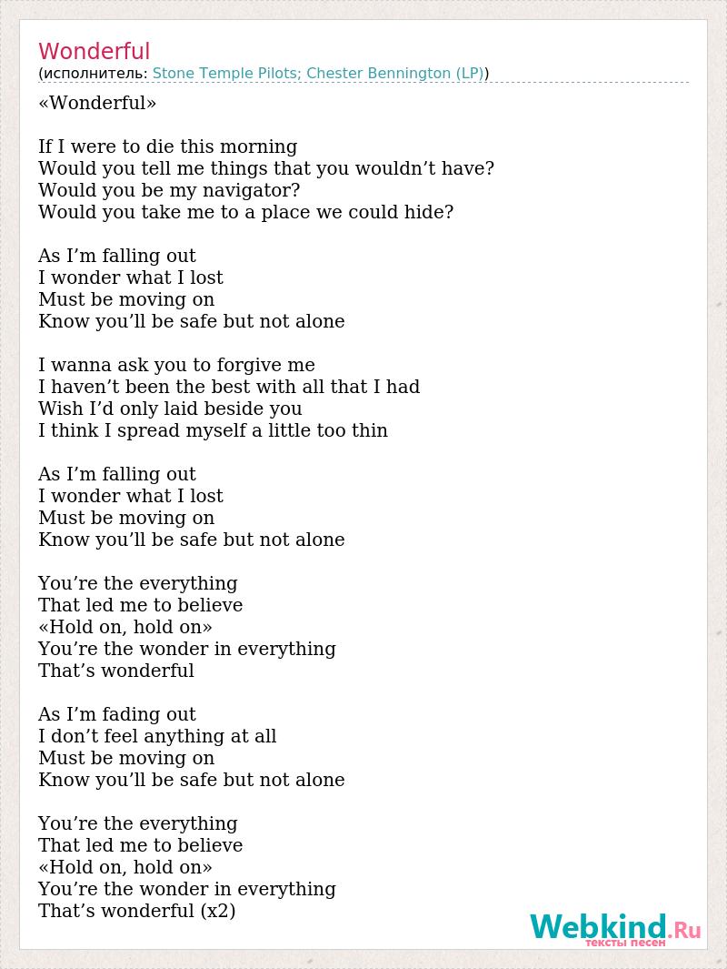 «Wonderful» If I were to die this morning Would you tell me things that you wouldn’t have? Would you be my navigator? Would you take me to a place we could hide? As I’m falling out I wonder what I lost Must be moving on Know you’ll be safe but not alone I wanna ask you to forgive me I haven’t been the best with all that I had Wish I’d only laid beside you I think I spread myself a little too thin As I’m falling out I wonder what I lost Must be moving on Know you’ll be safe but not alone You’re the everything That led me to believe «Hold on, hold on» You’re the wonder in everything That’s wonderful As I’m fading out I don’t feel anything at all Must be moving on Know you’ll be safe but not alone You’re the everything That led me to believe «Hold on, hold on» You’re the wonder in everything That’s wonderful (x2)
