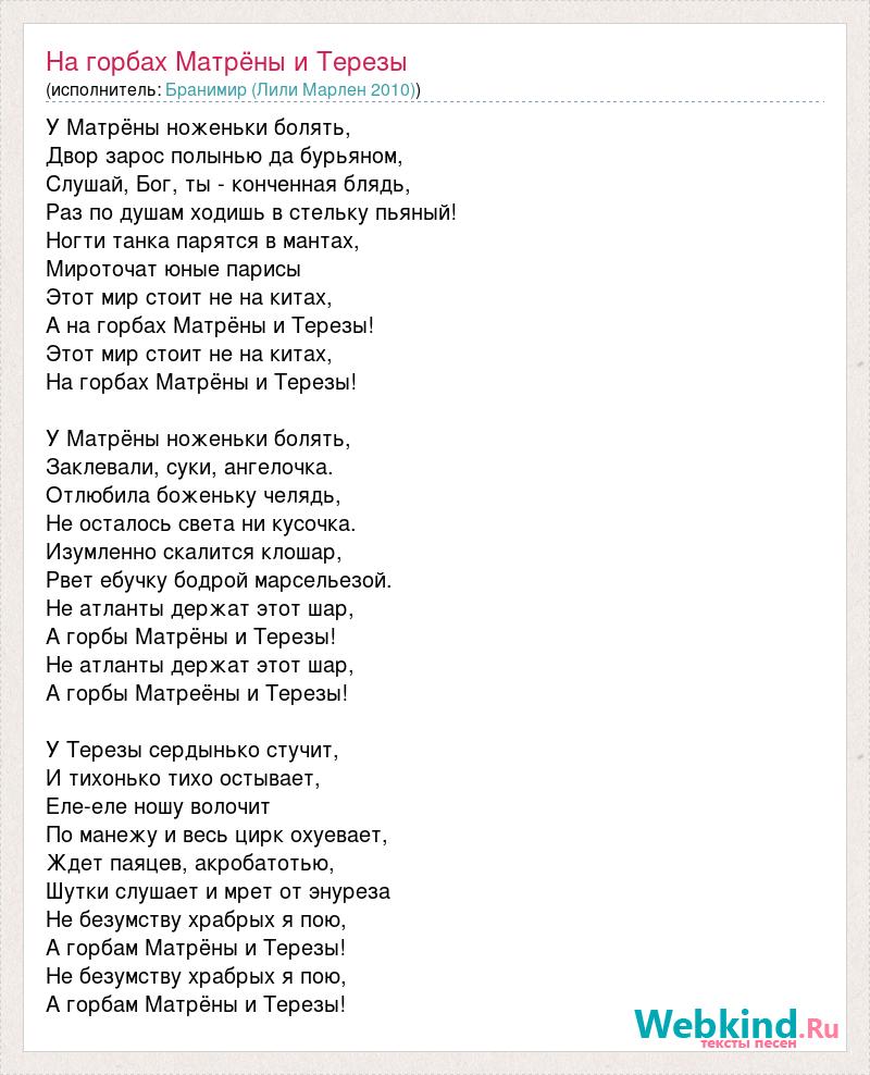У Матрёны ноженьки болять, Двор зарос полынью да бурьяном, Слушай, Бог, ты - конченная блядь, Раз по душам ходишь в стельку пьяный! Ногти танка парятся в мантах, Мироточат юные парисы Этот мир стоит не на китах, А на горбах Матрёны и Терезы! Этот мир стоит не на китах, На горбах Матрёны и Терезы! У Матрёны ноженьки болять, Заклевали, суки, ангелочка. Отлюбила боженьку челядь, Не осталось света ни кусочка. Изумленно скалится клошар, Рвет ебучку бодрой марсельезой. Не атланты держат этот шар, А горбы Матрёны и Терезы! Не атланты держат этот шар, А горбы Матреёны и Терезы! У Терезы сердынько стучит, И тихонько тихо остывает, Еле-еле ношу волочит По манежу и весь цирк охуевает, Ждет паяцев, акробатотью, Шутки слушает и мрет от энуреза Не безумству храбрых я пою, А горбам Матрёны и Терезы! Не безумству храбрых я пою, А горбам Матрёны и Терезы!