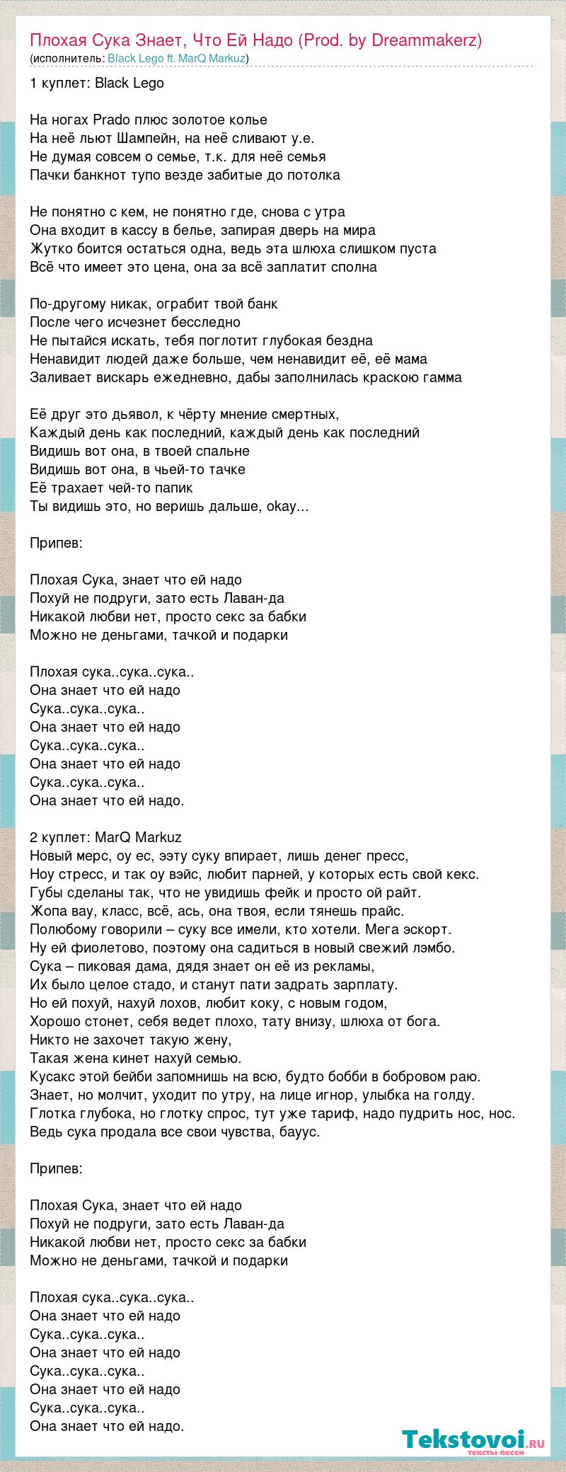 1 куплет: Black Lego На ногах Prado плюс золотое колье На неё льют Шампейн, на неё сливают у.е. Не думая совсем о семье, т.к. для неё семья Пачки банкнот тупо везде забитые до потолка Не понятно с кем, не понятно где, снова с утра Она входит в кассу в белье, запирая дверь на мира Жутко боится остаться одна, ведь эта шлюха слишком пуста Всё что имеет это цена, она за всё заплатит сполна По-другому никак, ограбит твой банк После чего исчезнет бесследно Не пытайся искать, тебя поглотит глубокая бездна Ненавидит людей даже больше, чем ненавидит её, её мама Заливает вискарь ежедневно, дабы заполнилась краскою гамма Её друг это дьявол, к чёрту мнение смертных, Каждый день как последний, каждый день как последний Видишь вот она, в твоей спальне Видишь вот она, в чьей-то тачке Её трахает чей-то папик Ты видишь это, но веришь дальше, okay... Припев: Плохая Сука, знает что ей надо Похуй не подруги, зато есть Лаван-да Никакой любви нет, просто секс за бабки Можно не деньгами, тачкой и подарки Плохая сука..сука..сука.. Она знает что ей надо Сука..сука..сука.. Она знает что ей надо Сука..сука..сука.. Она знает что ей надо Сука..сука..сука.. Она знает что ей надо. 2 куплет: MarQ Markuz Новый мерс, оу ес, ээту суку впирает, лишь денег пресс, Ноу стресс, и так оу вэйс, любит парней, у которых есть свой кекс. Губы сделаны так, что не увидишь фейк и просто ой райт. Жопа вау, класс, всё, ась, она твоя, если тянешь прайс. Полюбому говорили – суку все имели, кто хотели. Мега эскорт. Ну ей фиолетово, поэтому она садиться в новый свежий лэмбо. Сука – пиковая дама, дядя знает он её из рекламы, Их было целое стадо, и станут пати задрать зарплату. Но ей похуй, нахуй лохов, любит коку, с новым годом, Хорошо стонет, себя ведет плохо, тату внизу, шлюха от бога. Никто не захочет такую жену, Такая жена кинет нахуй семью. Кусакс этой бейби запомнишь на всю, будто бобби в бобровом раю. Знает, но молчит, уходит по утру, на лице игнор, улыбка на голду. Глотка глубока, но глотку спрос, тут уже тариф, надо пудрить нос, нос. Ведь сука продала все свои чувства, бауус. Припев: Плохая Сука, знает что ей надо Похуй не подруги, зато есть Лаван-да Никакой любви нет, просто секс за бабки Можно не деньгами, тачкой и подарки Плохая сука..сука..сука.. Она знает что ей надо Сука..сука..сука.. Она знает что ей надо Сука..сука..сука.. Она знает что ей надо Сука..сука..сука.. Она знает что ей надо.