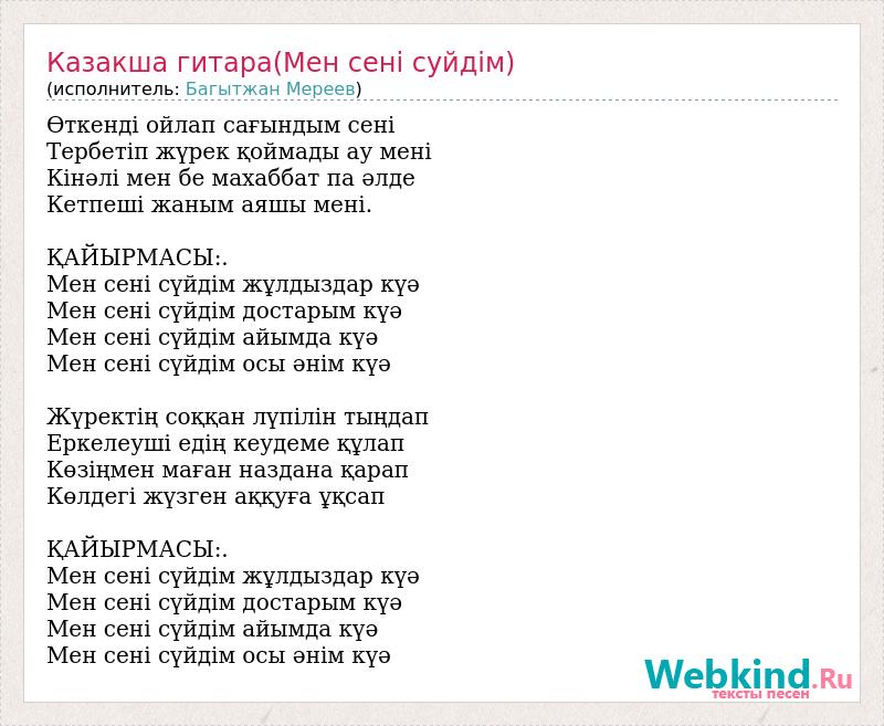 Өткенді ойлап сағындым сені Тербетіп жүрек қоймады ау мені Кінәлі мен бе махаббат па әлде Кетпеші жаным аяшы мені. ҚАЙЫРМАСЫ:. Мен сені сүйдім жұлдыздар күә Мен сені сүйдім достарым күә Мен сені сүйдім айымда күә Мен сені сүйдім осы әнім күә Жүректің соққан лүпілін тыңдап Еркелеуші едің кеудеме құлап Көзіңмен маған наздана қарап Көлдегі жүзген аққуға ұқсап ҚАЙЫРМАСЫ:. Мен сені сүйдім жұлдыздар күә Мен сені сүйдім достарым күә Мен сені сүйдім айымда күә Мен сені сүйдім осы әнім күә