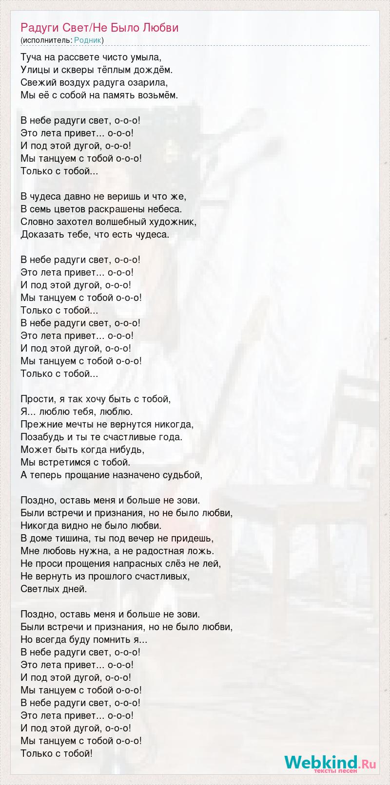 Туча на рассвете чисто умыла, Улицы и скверы тёплым дождём. Свежий воздух радуга озарила, Мы её с собой на память возьмём. В небе радуги свет, о-о-о! Это лета привет... о-о-о! И под этой дугой, о-о-о! Мы танцуем с тобой о-о-о! Только с тобой... В чудеса давно не веришь и что же, В семь цветов раскрашены небеса. Словно захотел волшебный художник, Доказать тебе, что есть чудеса. В небе радуги свет, о-о-о! Это лета привет... о-о-о! И под этой дугой, о-о-о! Мы танцуем с тобой о-о-о! Только с тобой... В небе радуги свет, о-о-о! Это лета привет... о-о-о! И под этой дугой, о-о-о! Мы танцуем с тобой о-о-о! Только с тобой... Прости, я так хочу быть с тобой, Я... люблю тебя, люблю. Прежние мечты не вернутся никогда, Позабудь и ты те счастливые года. Может быть когда нибудь, Мы встретимся с тобой. А теперь прощание назначено судьбой, Поздно, оставь меня и больше не зови. Были встречи и признания, но не было любви, Никогда видно не было любви. В доме тишина, ты под вечер не придешь, Мне любовь нужна, а не радостная ложь. Не проси прощения напрасных слёз не лей, Не вернуть из прошлого счастливых, Светлых дней. Поздно, оставь меня и больше не зови. Были встречи и признания, но не было любви, Но всегда буду помнить я... В небе радуги свет, о-о-о! Это лета привет... о-о-о! И под этой дугой, о-о-о! Мы танцуем с тобой о-о-о! В небе радуги свет, о-о-о! Это лета привет... о-о-о! И под этой дугой, о-о-о! Мы танцуем с тобой о-о-о! Только с тобой!