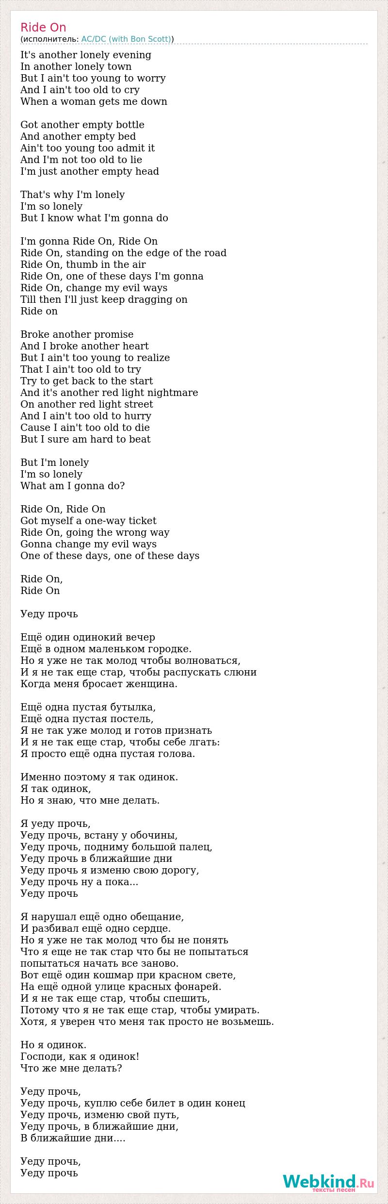 It's another lonely evening In another lonely town But I ain't too young to worry And I ain't too old to cry When a woman gets me down Got another empty bottle And another empty bed Ain't too young too admit it And I'm not too old to lie I'm just another empty head That's why I'm lonely I'm so lonely But I know what I'm gonna do I'm gonna Ride On, Ride On Ride On, standing on the edge of the road Ride On, thumb in the air Ride On, one of these days I'm gonna Ride On, change my evil ways Till then I'll just keep dragging on Ride on Broke another promise And I broke another heart But I ain't too young to realize That I ain't too old to try Try to get back to the start And it's another red light nightmare On another red light street And I ain't too old to hurry Cause I ain't too old to die But I sure am hard to beat But I'm lonely I'm so lonely What am I gonna do? Ride On, Ride On Got myself a one-way ticket Ride On, going the wrong way Gonna change my evil ways One of these days, one of these days Ride On, Ride On Уеду прочь Ещё один одинокий вечер Ещё в одном маленьком городке. Но я уже не так молод чтобы волноваться, И я не так еще стар, чтобы распускать слюни Когда меня бросает женщина. Ещё одна пустая бутылка, Ещё одна пустая постель, Я не так уже молод и готов признать И я не так еще стар, чтобы себе лгать: Я просто ещё одна пустая голова. Именно поэтому я так одинок. Я так одинок, Но я знаю, что мне делать. Я уеду прочь, Уеду прочь, встану у обочины, Уеду прочь, подниму большой палец, Уеду прочь в ближайшие дни Уеду прочь я изменю свою дорогу, Уеду прочь ну а пока... Уеду прочь Я нарушал ещё одно обещание, И разбивал ещё одно сердце. Но я уже не так молод что бы не понять Что я еще не так стар что бы не попытаться попытаться начать все заново. Вот ещё один кошмар при красном свете, На ещё одной улице красных фонарей. И я не так еще стар, чтобы спешить, Потому что я не так еще стар, чтобы умирать. Хотя, я уверен что меня так просто не возьмешь. Но я одинок. Господи, как я одинок! Что же мне делать? Уеду прочь, Уеду прочь, куплю себе билет в один конец Уеду прочь, изменю свой путь, Уеду прочь, в ближайшие дни, В ближайшие дни.... Уеду прочь, Уеду прочь