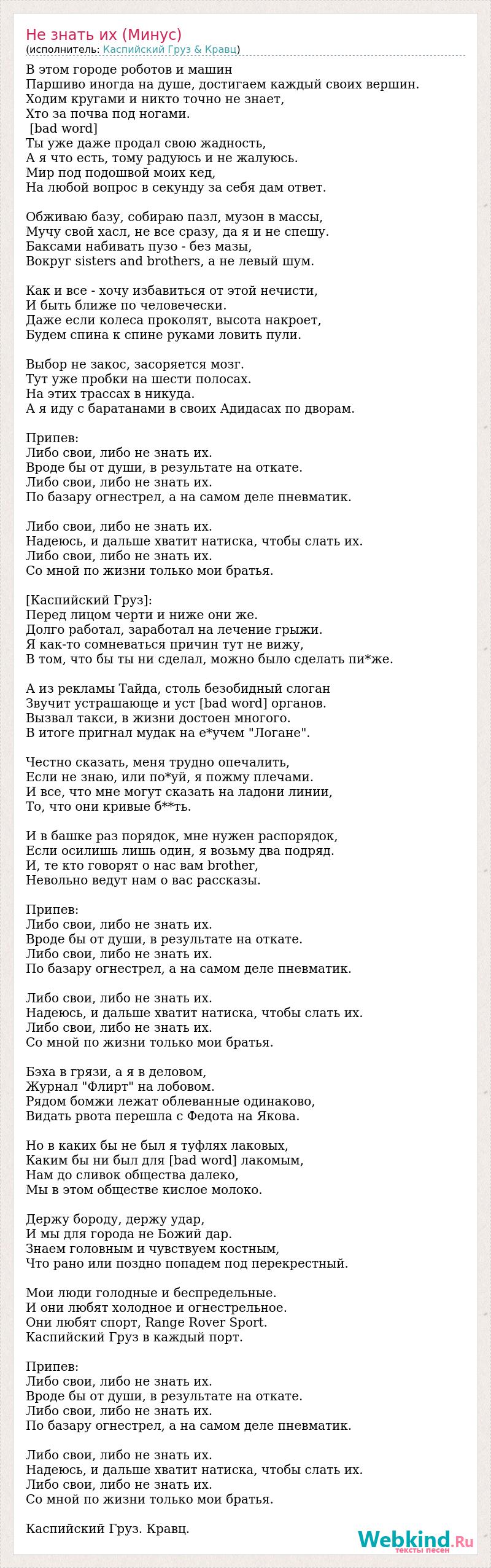 В этом городе роботов и машин Паршиво иногда на душе, достигаем каждый своих вершин. Ходим кругами и никто точно не знает, Xто за почва под ногами. [bad word] Ты уже даже продал свою жадность, А я что есть, тому радуюсь и не жалуюсь. Мир под подошвой моих кед, На любой вопрос в секунду за себя дам ответ. Обживаю базу, собираю пазл, музон в массы, Мучу свой хасл, не все сразу, да я и не спешу. Баксами набивать пузо - без мазы, Вокруг sisters and brothers, а не левый шум. Как и все - хочу избавиться от этой нечисти, И быть ближе по человечески. Даже если колеса проколят, высота накроет, Будем спина к спине руками ловить пули. Выбор не закос, засоряется мозг. Тут уже пробки на шести полосах. На этих трассах в никуда. А я иду с баратанами в своих Адидасах по дворам. Припев: Либо свои, либо не знать их. Вроде бы от души, в результате на откате. Либо свои, либо не знать их. По базару огнестрел, а на самом деле пневматик. Либо свои, либо не знать их. Надеюсь, и дальше хватит натиска, чтобы слать их. Либо свои, либо не знать их. Со мной по жизни только мои братья. [Каспийский Груз]: Перед лицом черти и ниже они же. Долго работал, заработал на лечение грыжи. Я как-то сомневаться причин тут не вижу, В том, что бы ты ни сделал, можно было сделать пи*же. А из рекламы Тайда, столь безобидный слоган Звучит устрашающе и уст [bad word] органов. Вызвал такси, в жизни достоен многого. В итоге пригнал мудак на е*учем "Логане". Честно сказать, меня трудно опечалить, Если не знаю, или по*уй, я пожму плечами. И все, что мне могут сказать на ладони линии, То, что они кривые б**ть. И в башке раз порядок, мне нужен распорядок, Если осилишь лишь один, я возьму два подряд. И, те кто говорят о нас вам brother, Невольно ведут нам о вас рассказы. Припев: Либо свои, либо не знать их. Вроде бы от души, в результате на откате. Либо свои, либо не знать их. По базару огнестрел, а на самом деле пневматик. Либо свои, либо не знать их. Надеюсь, и дальше хватит натиска, чтобы слать их. Либо свои, либо не знать их. Со мной по жизни только мои братья. Бэха в грязи, а я в деловом, Журнал "Флирт" на лобовом. Рядом бомжи лежат облеванные одинаково, Видать рвота перешла с Федота на Якова. Но в каких бы не был я туфлях лаковых, Каким бы ни был для [bad word] лакомым, Нам до сливок общества далеко, Мы в этом обществе кислое молоко. Держу бороду, держу удар, И мы для города не Божий дар. Знаем головным и чувствуем костным, Что рано или поздно попадем под перекрестный. Мои люди голодные и беспредельные. И они любят холодное и огнестрельное. Они любят спорт, Range Rover Sport. Каспийский Груз в каждый порт. Припев: Либо свои, либо не знать их. Вроде бы от души, в результате на откате. Либо свои, либо не знать их. По базару огнестрел, а на самом деле пневматик. Либо свои, либо не знать их. Надеюсь, и дальше хватит натиска, чтобы слать их. Либо свои, либо не знать их. Со мной по жизни только мои братья. Каспийский Груз. Кравц.