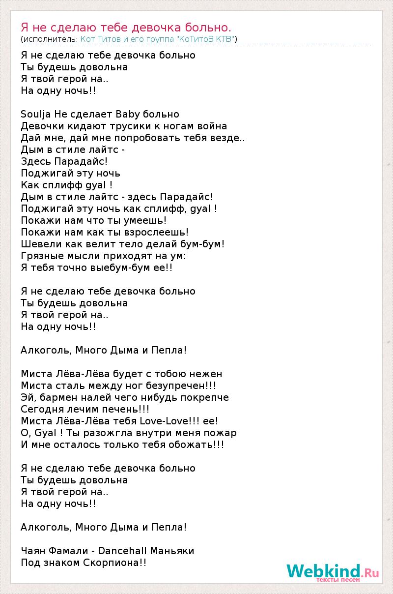 Я не сделаю тебе девочка больно Ты будешь довольна Я твой герой на.. На одну ночь!! Soulja Не сделает Baby больно Девочки кидают трусики к ногам война Дай мне, дай мне попробовать тебя везде.. Дым в стиле лайтс - Здесь Парадайс! Поджигай эту ночь Как сплифф gyal ! Дым в стиле лайтс - здесь Парадайс! Поджигай эту ночь как сплифф, gyal ! Покажи нам что ты умеешь! Покажи нам как ты взрослеешь! Шевели как велит тело делай бум-бум! Грязные мысли приходят на ум: Я тебя точно выебум-бум ее!! Я не сделаю тебе девочка больно Ты будешь довольна Я твой герой на.. На одну ночь!! Алкоголь, Много Дыма и Пепла! Миста Лёва-Лёва будет с тобою нежен Миста сталь между ног безупречен!!! Эй, бармен налей чего нибудь покрепче Сегодня лечим печень!!! Миста Лёва-Лёва тебя Love-Love!!! ее! O, Gyal ! Ты разожгла внутри меня пожар И мне осталось только тебя обожать!!! Я не сделаю тебе девочка больно Ты будешь довольна Я твой герой на.. На одну ночь!! Алкоголь, Много Дыма и Пепла! Чаян Фамали - Dancehall Маньяки Под знаком Скорпиона!!