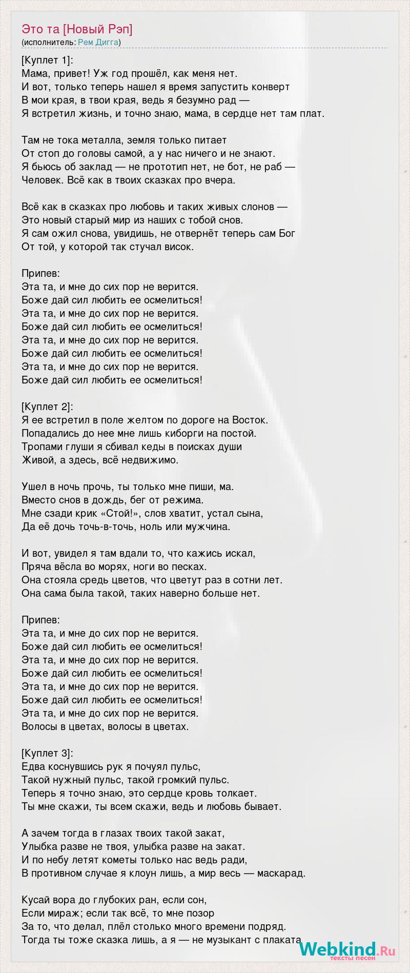 [Куплет 1]: Мама, привет! Уж год прошёл, как меня нет. И вот, только теперь нашел я время запустить конверт В мои края, в твои края, ведь я безумно рад — Я встретил жизнь, и точно знаю, мама, в сердце нет там плат. Там не тока металла, земля только питает От стоп до головы самой, а у нас ничего и не знают. Я бьюсь об заклад — не прототип нет, не бот, не раб — Человек. Всё как в твоих сказках про вчера. Всё как в сказках про любовь и таких живых слонов — Это новый старый мир из наших с тобой снов. Я сам ожил снова, увидишь, не отвернёт теперь сам Бог От той, у которой так стучал висок. Припев: Эта та, и мне до сих пор не верится. Боже дай сил любить ее осмелиться! Эта та, и мне до сих пор не верится. Боже дай сил любить ее осмелиться! Эта та, и мне до сих пор не верится. Боже дай сил любить ее осмелиться! Эта та, и мне до сих пор не верится. Боже дай сил любить ее осмелиться! [Куплет 2]: Я ее встретил в поле желтом по дороге на Восток. Попадались до нее мне лишь киборги на постой. Тропами глуши я сбивал кеды в поисках души Живой, а здесь, всё недвижимо. Ушел в ночь прочь, ты только мне пиши, ма. Вместо снов в дождь, бег от режима. Мне сзади крик «Стой!», слов хватит, устал сына, Да её дочь точь-в-точь, ноль или мужчина. И вот, увидел я там вдали то, что кажись искал, Пряча вёсла во морях, ноги во песках. Она стояла средь цветов, что цветут раз в сотни лет. Она сама была такой, таких наверно больше нет. Припев: Эта та, и мне до сих пор не верится. Боже дай сил любить ее осмелиться! Эта та, и мне до сих пор не верится. Боже дай сил любить ее осмелиться! Эта та, и мне до сих пор не верится. Боже дай сил любить ее осмелиться! Эта та, и мне до сих пор не верится. Волосы в цветах, волосы в цветах. [Куплет 3]: Едва коснувшись рук я почуял пульс, Такой нужный пульс, такой громкий пульс. Теперь я точно знаю, это сердце кровь толкает. Ты мне скажи, ты всем скажи, ведь и любовь бывает. А зачем тогда в глазах твоих такой закат, Улыбка разве не твоя, улыбка разве на закат. И по небу летят кометы только нас ведь ради, В противном случае я клоун лишь, а мир весь — маскарад. Кусай вора до глубоких ран, если сон, Если мираж; если так всё, то мне позор За то, что делал, плёл столько много времени подряд. Тогда ты тоже сказка лишь, а я — не музыкант с плаката