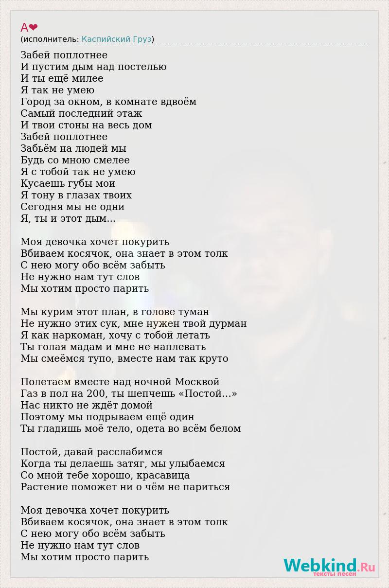 Забей поплотнее И пустим дым над постелью И ты ещё милее Я так не умею Город за окном, в комнате вдвоём Самый последний этаж И твои стоны на весь дом Забей поплотнее Забьём на людей мы Будь со мною смелее Я с тобой так не умею Кусаешь губы мои Я тону в глазах твоих Сегодня мы не одни Я, ты и этот дым... Моя девочка хочет покурить Вбиваем косячок, она знает в этом толк С нею могу обо всём забыть Не нужно нам тут слов Мы хотим просто парить Мы курим этот план, в голове туман Не нужно этих сук, мне нужен твой дурман Я как наркоман, хочу с тобой летать Ты голая мадам и мне не наплевать Мы смеёмся тупо, вместе нам так круто Полетаем вместе над ночной Москвой Газ в пол на 200, ты шепчешь «Постой…» Нас никто не ждёт домой Поэтому мы подрываем ещё один Ты гладишь моё тело, одета во всём белом Постой, давай расслабимся Когда ты делаешь затяг, мы улыбаемся Со мной тебе хорошо, красавица Растение поможет ни о чём не париться Моя девочка хочет покурить Вбиваем косячок, она знает в этом толк С нею могу обо всём забыть Не нужно нам тут слов Мы хотим просто парить