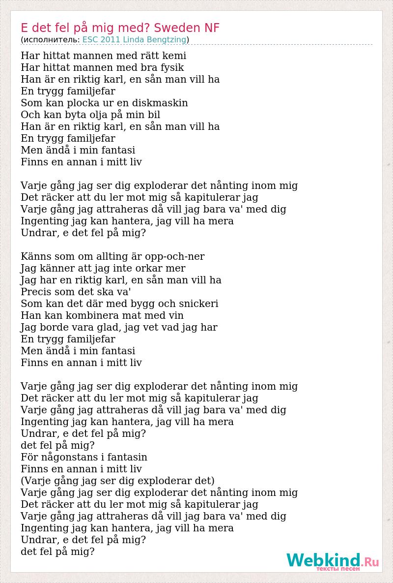 А как ты думаешь, о чем песня "E det fel på mig med? Sweden NF" ?