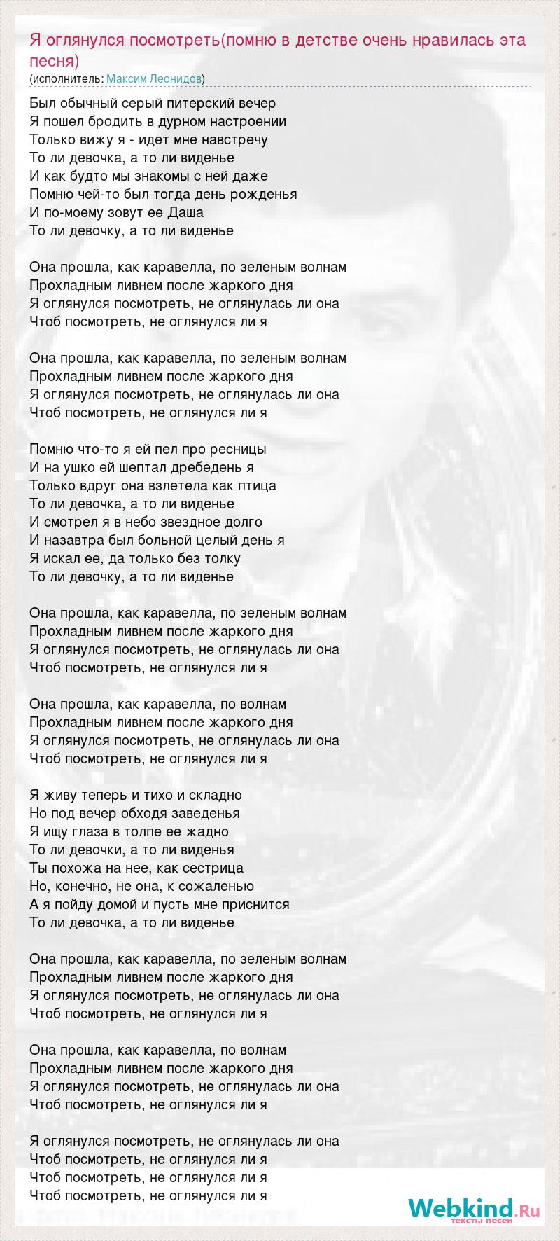 Был обычный серый питерский вечер Я пошел бродить в дурном настроении Только вижу я - идет мне навстречу То ли девочка, а то ли виденье И как будто мы знакомы с ней даже Помню чей-то был тогда день рожденья И по-моему зовут ее Даша То ли девочку, а то ли виденье Она прошла, как каравелла, по зеленым волнам Прохладным ливнем после жаркого дня Я оглянулся посмотреть, не оглянулась ли она Чтоб посмотреть, не оглянулся ли я Она прошла, как каравелла, по зеленым волнам Прохладным ливнем после жаркого дня Я оглянулся посмотреть, не оглянулась ли она Чтоб посмотреть, не оглянулся ли я Помню что-то я ей пел про ресницы И на ушко ей шептал дребедень я Только вдруг она взлетела как птица То ли девочка, а то ли виденье И смотрел я в небо звездное долго И назавтра был больной целый день я Я искал ее, да только без толку То ли девочку, а то ли виденье Она прошла, как каравелла, по зеленым волнам Прохладным ливнем после жаркого дня Я оглянулся посмотреть, не оглянулась ли она Чтоб посмотреть, не оглянулся ли я Она прошла, как каравелла, по волнам Прохладным ливнем после жаркого дня Я оглянулся посмотреть, не оглянулась ли она Чтоб посмотреть, не оглянулся ли я Я живу теперь и тихо и складно Но под вечер обходя заведенья Я ищу глаза в толпе ее жадно То ли девочки, а то ли виденья Ты похожа на нее, как сестрица Но, конечно, не она, к сожаленью А я пойду домой и пусть мне приснится То ли девочка, а то ли виденье Она прошла, как каравелла, по зеленым волнам Прохладным ливнем после жаркого дня Я оглянулся посмотреть, не оглянулась ли она Чтоб посмотреть, не оглянулся ли я Она прошла, как каравелла, по волнам Прохладным ливнем после жаркого дня Я оглянулся посмотреть, не оглянулась ли она Чтоб посмотреть, не оглянулся ли я Я оглянулся посмотреть, не оглянулась ли она Чтоб посмотреть, не оглянулся ли я Чтоб посмотреть, не оглянулся ли я Чтоб посмотреть, не оглянулся ли я