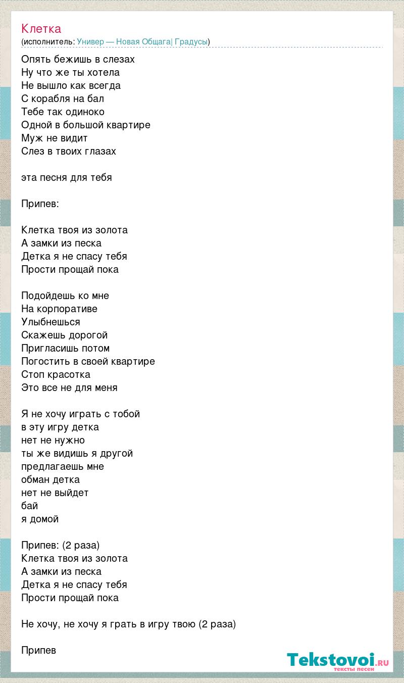 Опять бежишь в слезах Ну что же ты хотела Не вышло как всегда С корабля на бал Тебе так одиноко Одной в большой квартире Муж не видит Слез в твоих глазах эта песня для тебя Припев: Клетка твоя из золота А замки из песка Детка я не спасу тебя Прости прощай пока Подойдешь ко мне На корпоративе Улыбнешься Скажешь дорогой Пригласишь потом Погостить в своей квартире Стоп красотка Это все не для меня Я не хочу играть с тобой в эту игру детка нет не нужно ты же видишь я другой предлагаешь мне обман детка нет не выйдет бай я домой Припев: (2 раза) Клетка твоя из золота А замки из песка Детка я не спасу тебя Прости прощай пока Не хочу, не хочу я грать в игру твою (2 раза) Припев