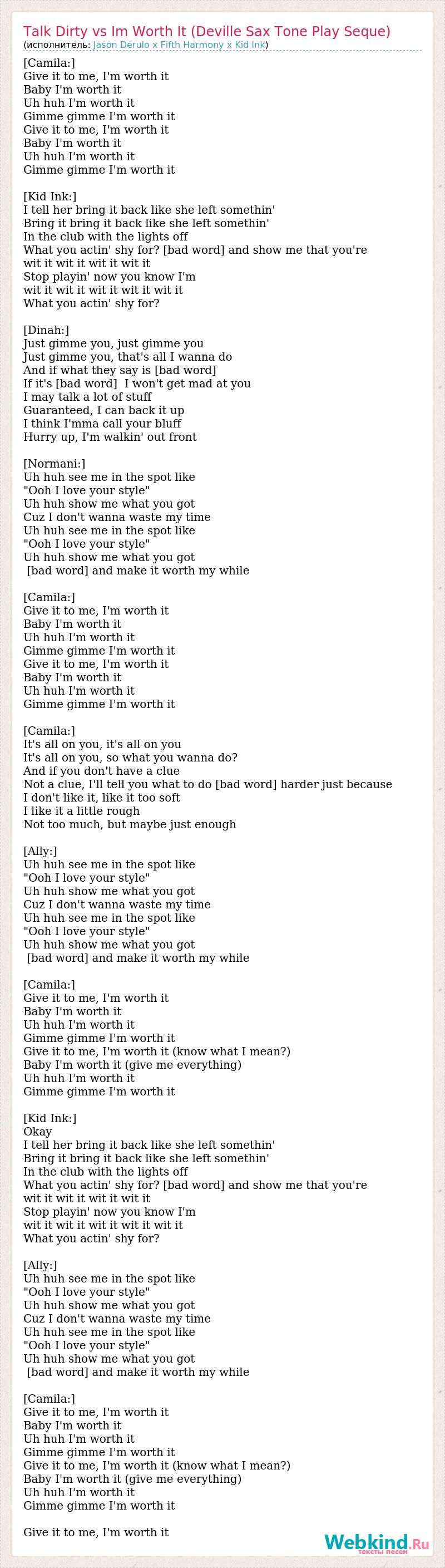 [Camila:] Give it to me, I'm worth it Baby I'm worth it Uh huh I'm worth it Gimme gimme I'm worth it Give it to me, I'm worth it Baby I'm worth it Uh huh I'm worth it Gimme gimme I'm worth it [Kid Ink:] I tell her bring it back like she left somethin' Bring it bring it back like she left somethin' In the club with the lights off What you actin' shy for? [bad word] and show me that you're wit it wit it wit it wit it Stop playin' now you know I'm wit it wit it wit it wit it wit it What you actin' shy for? [Dinah:] Just gimme you, just gimme you Just gimme you, that's all I wanna do And if what they say is [bad word] If it's [bad word] I won't get mad at you I may talk a lot of stuff Guaranteed, I can back it up I think I'mma call your bluff Hurry up, I'm walkin' out front [Normani:] Uh huh see me in the spot like "Ooh I love your style" Uh huh show me what you got Cuz I don't wanna waste my time Uh huh see me in the spot like "Ooh I love your style" Uh huh show me what you got [bad word] and make it worth my while [Camila:] Give it to me, I'm worth it Baby I'm worth it Uh huh I'm worth it Gimme gimme I'm worth it Give it to me, I'm worth it Baby I'm worth it Uh huh I'm worth it Gimme gimme I'm worth it [Camila:] It's all on you, it's all on you It's all on you, so what you wanna do? And if you don't have a clue Not a clue, I'll tell you what to do [bad word] harder just because I don't like it, like it too soft I like it a little rough Not too much, but maybe just enough [Ally:] Uh huh see me in the spot like "Ooh I love your style" Uh huh show me what you got Cuz I don't wanna waste my time Uh huh see me in the spot like "Ooh I love your style" Uh huh show me what you got [bad word] and make it worth my while [Camila:] Give it to me, I'm worth it Baby I'm worth it Uh huh I'm worth it Gimme gimme I'm worth it Give it to me, I'm worth it (know what I mean?) Baby I'm worth it (give me everything) Uh huh I'm worth it Gimme gimme I'm worth it [Kid Ink:] Okay I tell her bring it back like she left somethin' Bring it bring it back like she left somethin' In the club with the lights off What you actin' shy for? [bad word] and show me that you're wit it wit it wit it wit it Stop playin' now you know I'm wit it wit it wit it wit it wit it What you actin' shy for? [Ally:] Uh huh see me in the spot like "Ooh I love your style" Uh huh show me what you got Cuz I don't wanna waste my time Uh huh see me in the spot like "Ooh I love your style" Uh huh show me what you got [bad word] and make it worth my while [Camila:] Give it to me, I'm worth it Baby I'm worth it Uh huh I'm worth it Gimme gimme I'm worth it Give it to me, I'm worth it (know what I mean?) Baby I'm worth it (give me everything) Uh huh I'm worth it Gimme gimme I'm worth it Give it to me, I'm worth it