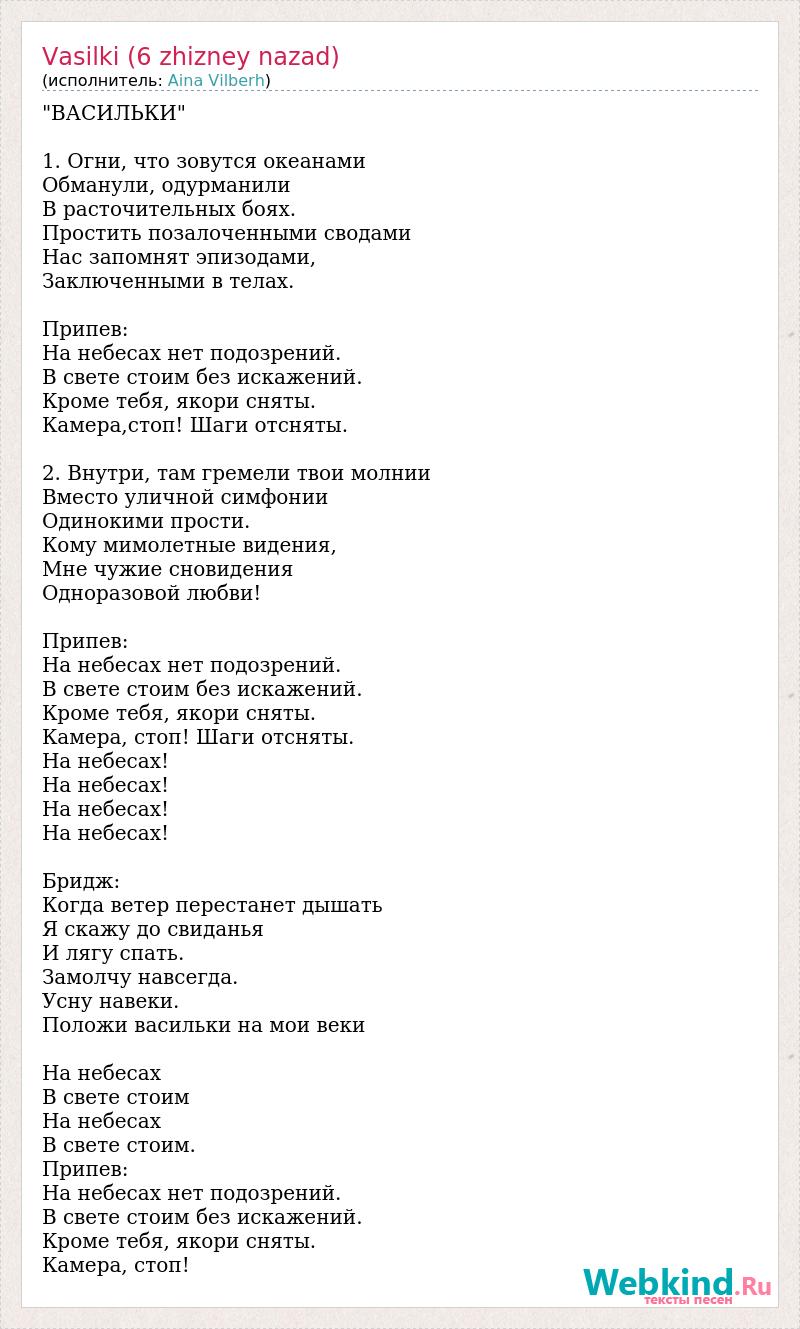 "ВАСИЛЬКИ" 1. Огни, что зовутся океанами Обманули, одурманили В расточительных боях. Простить позалоченными сводами Нас запомнят эпизодами, Заключенными в телах. Припев: На небесах нет подозрений. В свете стоим без искажений. Кроме тебя, якори сняты. Камера,стоп! Шаги отсняты. 2. Внутри, там гремели твои молнии Вместо уличной симфонии Одинокими прости. Кому мимолетные видения, Мне чужие сновидения Одноразовой любви! Припев: На небесах нет подозрений. В свете стоим без искажений. Кроме тебя, якори сняты. Камера, стоп! Шаги отсняты. На небесах! На небесах! На небесах! На небесах! Бридж: Когда ветер перестанет дышать Я скажу до свиданья И лягу спать. Замолчу навсегда. Усну навеки. Положи васильки на мои веки На небесах В свете стоим На небесах В свете стоим. Припев: На небесах нет подозрений. В свете стоим без искажений. Кроме тебя, якори сняты. Камера, стоп!