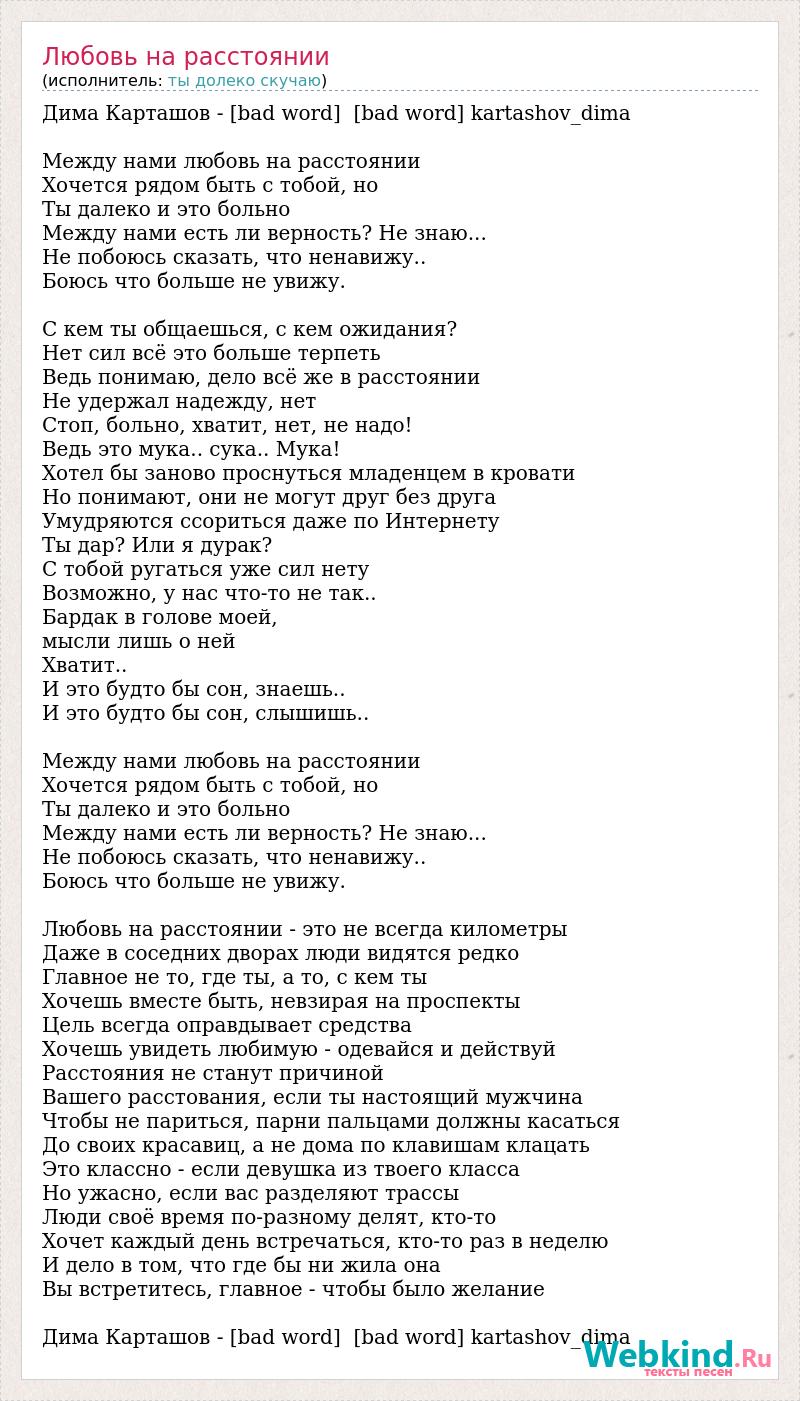 Дима Карташов - [bad word] [bad word] kartashov_dima Между нами любовь на расстоянии Хочется рядом быть с тобой, но Ты далеко и это больно Между нами есть ли верность? Не знаю... Не побоюсь сказать, что ненавижу.. Боюсь что больше не увижу. С кем ты общаешься, с кем ожидания? Нет сил всё это больше терпеть Ведь понимаю, дело всё же в расстоянии Не удержал надежду, нет Стоп, больно, хватит, нет, не надо! Ведь это мука.. сука.. Мука! Хотел бы заново проснуться младенцем в кровати Но понимают, они не могут друг без друга Умудряются ссориться даже по Интернету Ты дар? Или я дурак? С тобой ругаться уже сил нету Возможно, у нас что-то не так.. Бардак в голове моей, мысли лишь о ней Хватит.. И это будто бы сон, знаешь.. И это будто бы сон, слышишь.. Между нами любовь на расстоянии Хочется рядом быть с тобой, но Ты далеко и это больно Между нами есть ли верность? Не знаю... Не побоюсь сказать, что ненавижу.. Боюсь что больше не увижу. Любовь на расстоянии - это не всегда километры Даже в соседних дворах люди видятся редко Главное не то, где ты, а то, с кем ты Хочешь вместе быть, невзирая на проспекты Цель всегда оправдывает средства Хочешь увидеть любимую - одевайся и действуй Расстояния не станут причиной Вашего расстования, если ты настоящий мужчина Чтобы не париться, парни пальцами должны касаться До своих красавиц, а не дома по клавишам клацать Это классно - если девушка из твоего класса Но ужасно, если вас разделяют трассы Люди своё время по-разному делят, кто-то Хочет каждый день встречаться, кто-то раз в неделю И дело в том, что где бы ни жила она Вы встретитесь, главное - чтобы было желание Дима Карташов - [bad word] [bad word] kartashov_dima