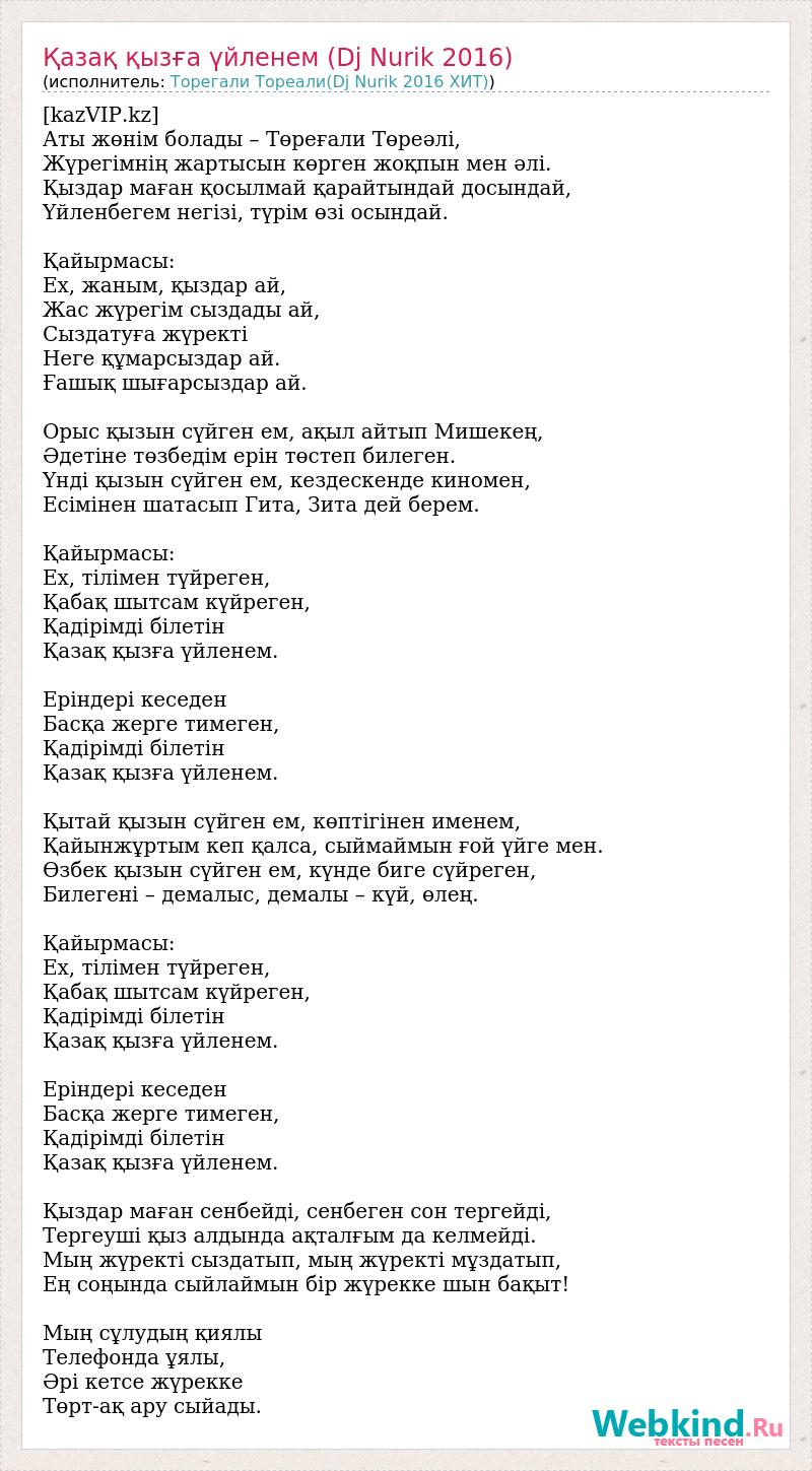 [kazVIP.kz] Аты жөнім болады – Төреғали Төреәлі, Жүрегімнің жартысын көрген жоқпын мен әлі. Қыздар маған қосылмай қарайтындай досындай, Үйленбегем негізі, түрім өзі осындай. Қайырмасы: Ех, жаным, қыздар ай, Жас жүрегім сыздады ай, Сыздатуға жүректі Неге құмарсыздар ай. Ғашық шығарсыздар ай. Орыс қызын сүйген ем, ақыл айтып Мишекең, Әдетіне төзбедім ерін төстеп билеген. Үнді қызын сүйген ем, кездескенде киномен, Есімінен шатасып Гита, Зита дей берем. Қайырмасы: Ех, тілімен түйреген, Қабақ шытсам күйреген, Қадірімді білетін Қазақ қызға үйленем. Еріндері кеседен Басқа жерге тимеген, Қадірімді білетін Қазақ қызға үйленем. Қытай қызын сүйген ем, көптігінен именем, Қайынжұртым кеп қалса, сыймаймын ғой үйге мен. Өзбек қызын сүйген ем, күнде биге сүйреген, Билегені – демалыс, демалы – күй, өлең. Қайырмасы: Ех, тілімен түйреген, Қабақ шытсам күйреген, Қадірімді білетін Қазақ қызға үйленем. Еріндері кеседен Басқа жерге тимеген, Қадірімді білетін Қазақ қызға үйленем. Қыздар маған сенбейді, сенбеген сон тергейді, Тергеуші қыз алдында ақталғым да келмейді. Мың жүректі сыздатып, мың жүректі мұздатып, Ең соңында сыйлаймын бір жүрекке шын бақыт! Мың сұлудың қиялы Телефонда ұялы, Әрі кетсе жүрекке Төрт-ақ ару сыйады.