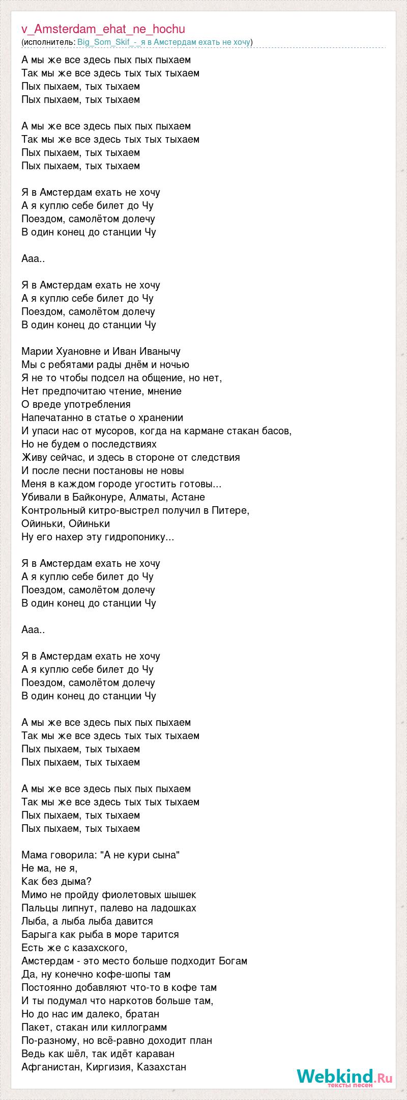 А мы же все здесь пых пых пыхаем Так мы же все здесь тых тых тыхаем Пых пыхаем, тых тыхаем Пых пыхаем, тых тыхаем А мы же все здесь пых пых пыхаем Так мы же все здесь тых тых тыхаем Пых пыхаем, тых тыхаем Пых пыхаем, тых тыхаем Я в Амстердам ехать не хочу А я куплю себе билет до Чу Поездом, самолётом долечу В один конец до станции Чу Ааа.. Я в Амстердам ехать не хочу А я куплю себе билет до Чу Поездом, самолётом долечу В один конец до станции Чу Марии Хуановне и Иван Иванычу Мы с ребятами рады днём и ночью Я не то чтобы подсел на общение, но нет, Нет предпочитаю чтение, мнение О вреде употребления Напечатанно в статье о хранении И упаси нас от мусоров, когда на кармане стакан басов, Но не будем о последствиях Живу сейчас, и здесь в стороне от следствия И после песни постановы не новы Меня в каждом городе угостить готовы... Убивали в Байконуре, Алматы, Астане Контрольный китро-выстрел получил в Питере, Ойиньки, Ойиньки Ну его нахер эту гидропонику... Я в Амстердам ехать не хочу А я куплю себе билет до Чу Поездом, самолётом долечу В один конец до станции Чу Ааа.. Я в Амстердам ехать не хочу А я куплю себе билет до Чу Поездом, самолётом долечу В один конец до станции Чу А мы же все здесь пых пых пыхаем Так мы же все здесь тых тых тыхаем Пых пыхаем, тых тыхаем Пых пыхаем, тых тыхаем А мы же все здесь пых пых пыхаем Так мы же все здесь тых тых тыхаем Пых пыхаем, тых тыхаем Пых пыхаем, тых тыхаем Мама говорила: "А не кури сына" Не ма, не я, Как без дыма? Мимо не пройду фиолетовых шышек Пальцы липнут, палево на ладошках Лыба, а лыба лыба давится Барыга как рыба в море тарится Есть же с казахского, Амстердам - это место больше подходит Богам Да, ну конечно кофе-шопы там Постоянно добавляют что-то в кофе там И ты подумал что наркотов больше там, Но до нас им далеко, братан Пакет, стакан или киллограмм По-разному, но всё-равно доходит план Ведь как шёл, так идёт караван Афганистан, Киргизия, Казахстан